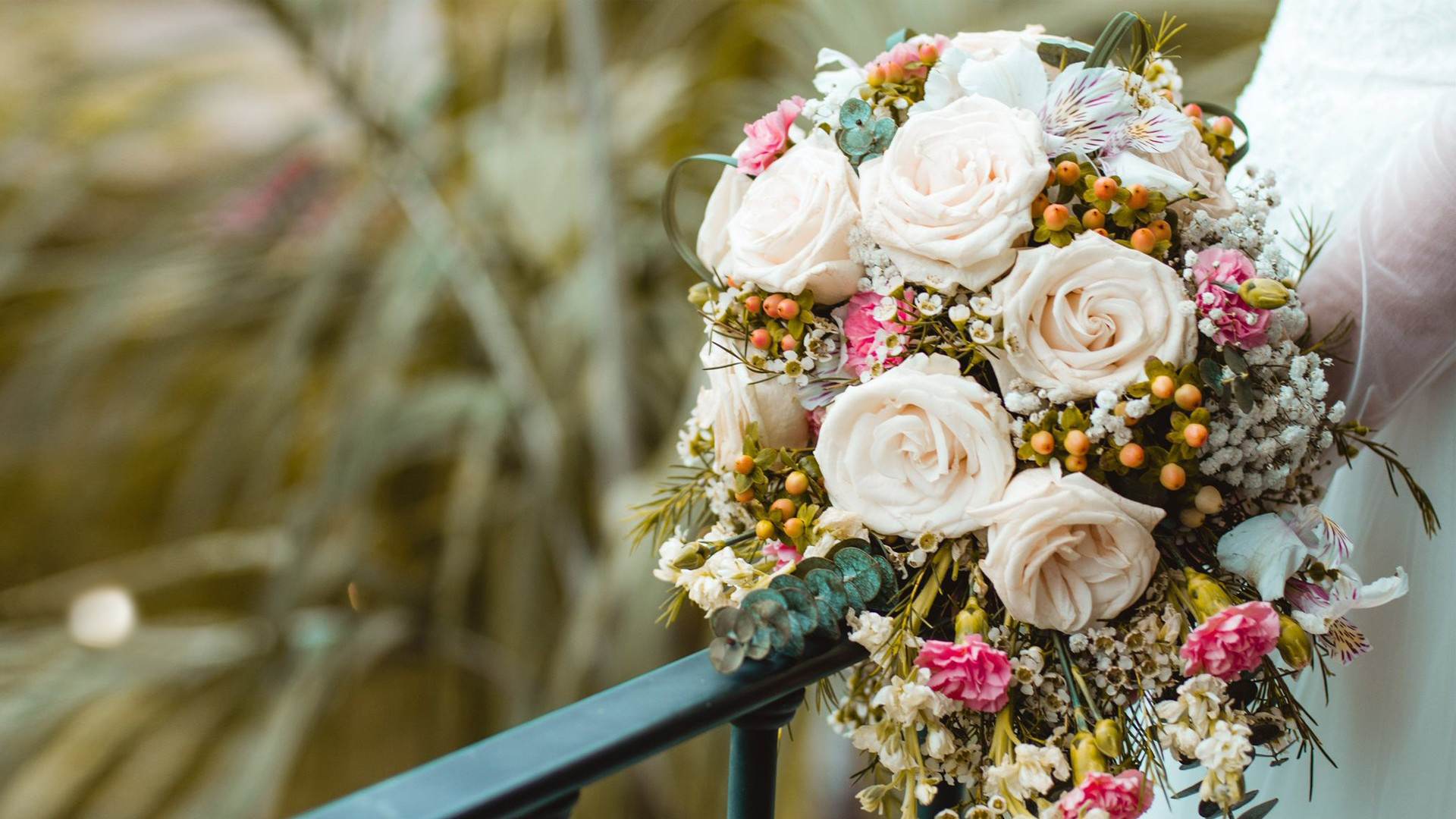 Description: A bridal bouquet of flowers on a railing outside a building in the daytime light.