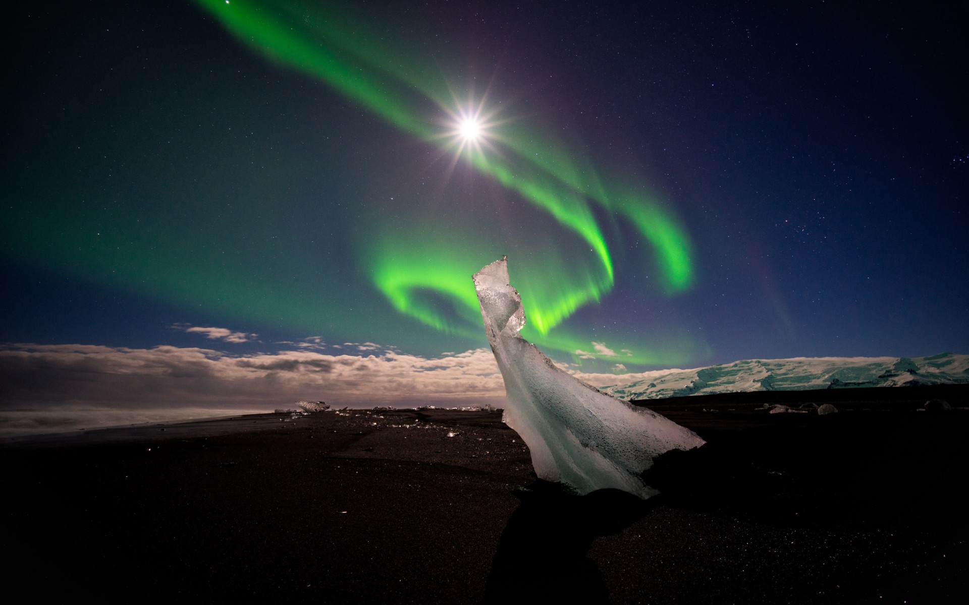 Description: A bride in a wedding dress standing under the aurora lights in iceland.