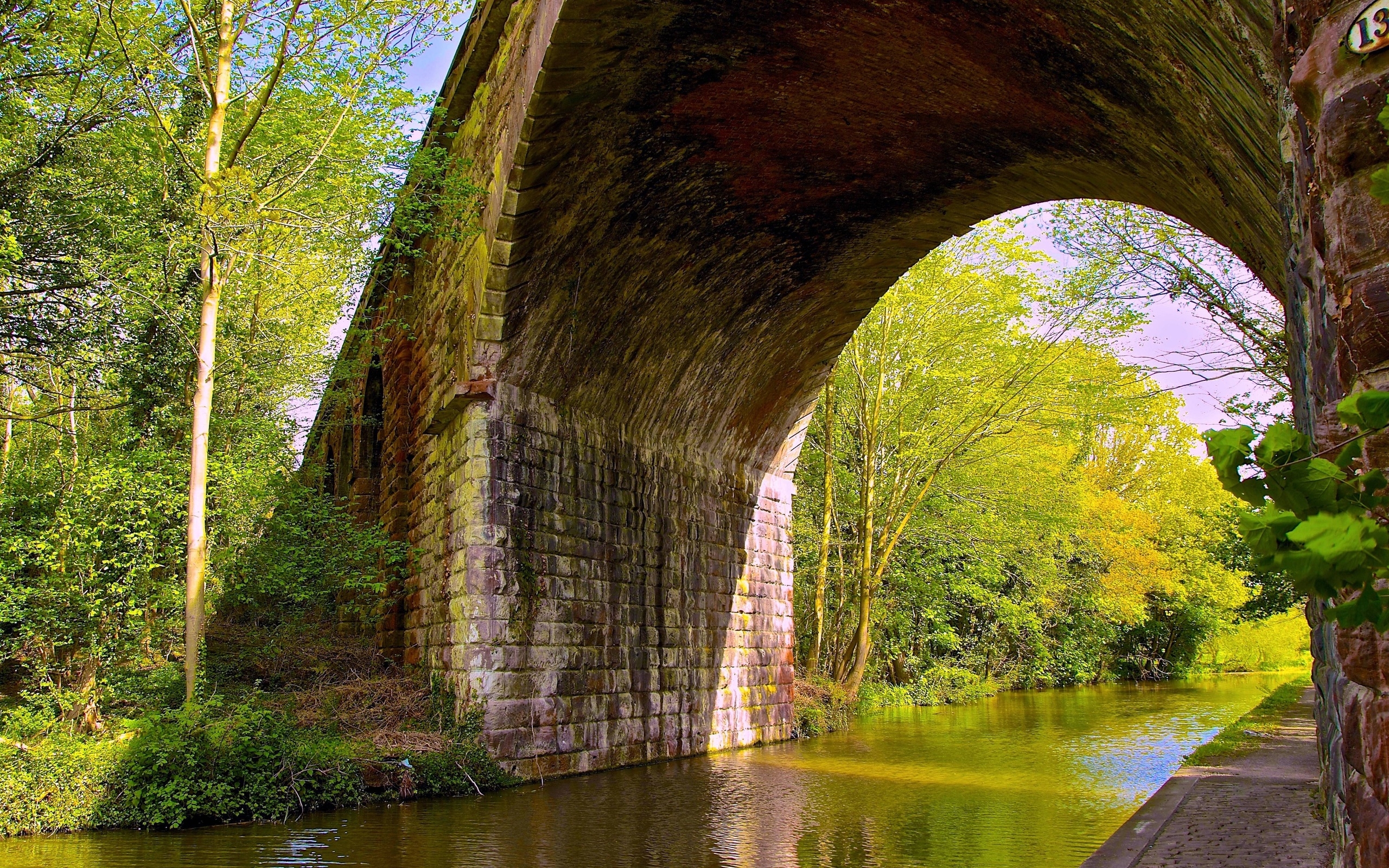 Description: A bridge over a river with a brick arch over it's sides and a river below it with a green tree lined bank.