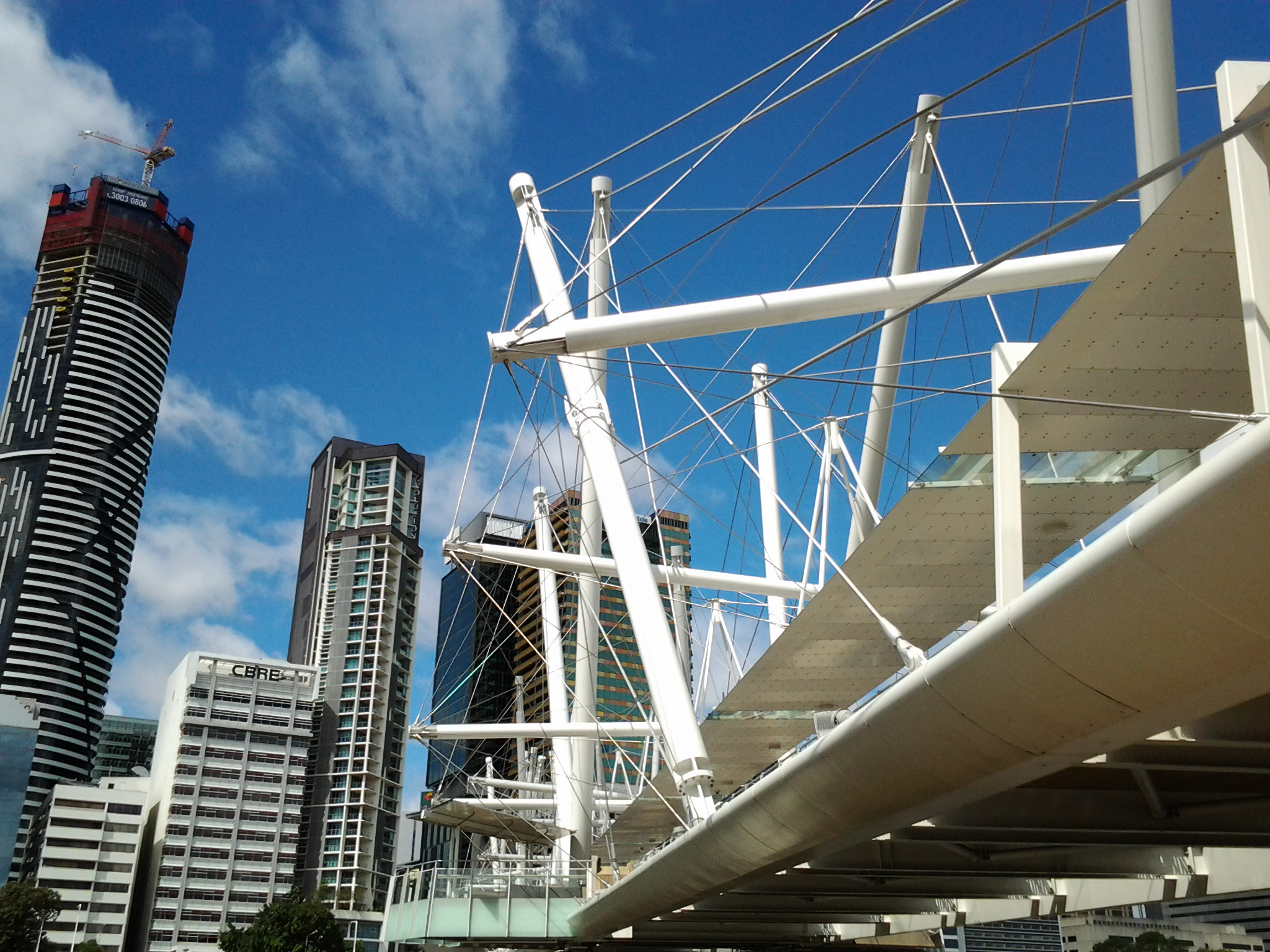 Description: A bridge with a building in the background and a blue sky with clouds in the background and a few buildings in the foreground.