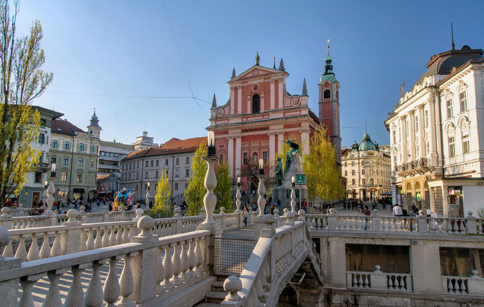 Description: A bridge with a building in the background and people walking on it in the foreground and a few buildings in the background.