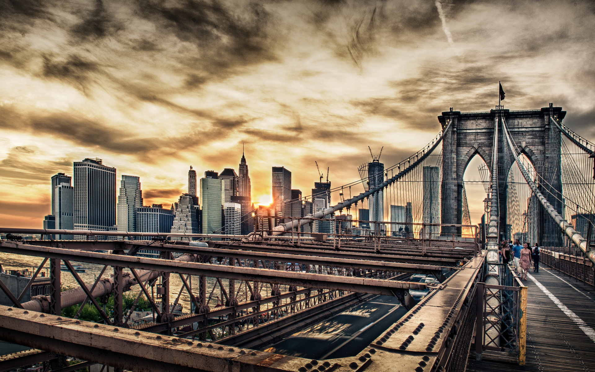 Description: A bridge with a city skyline in the background at sunset or dawn with a few people walking on the bridge.