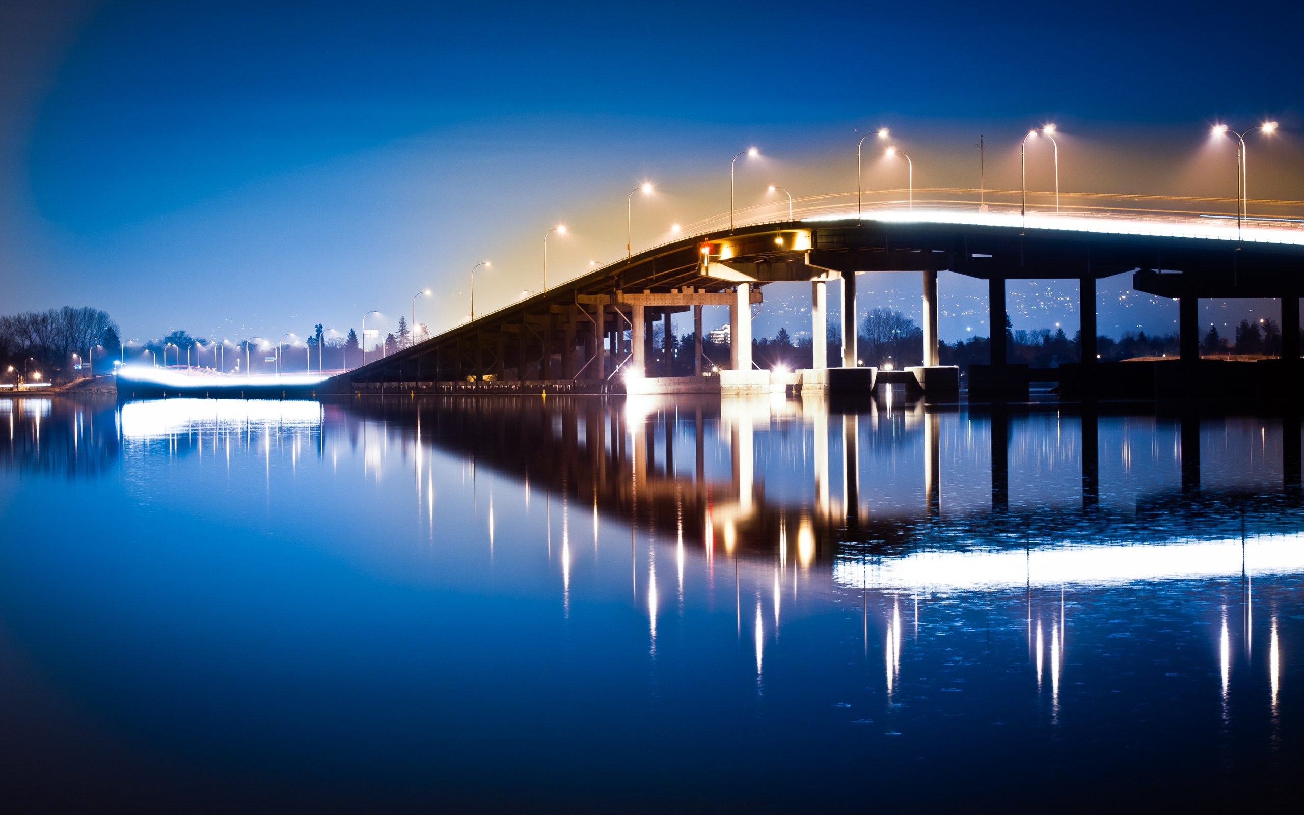 Description: A bridge over a body of water at night with lights on it and a boat in the water below.