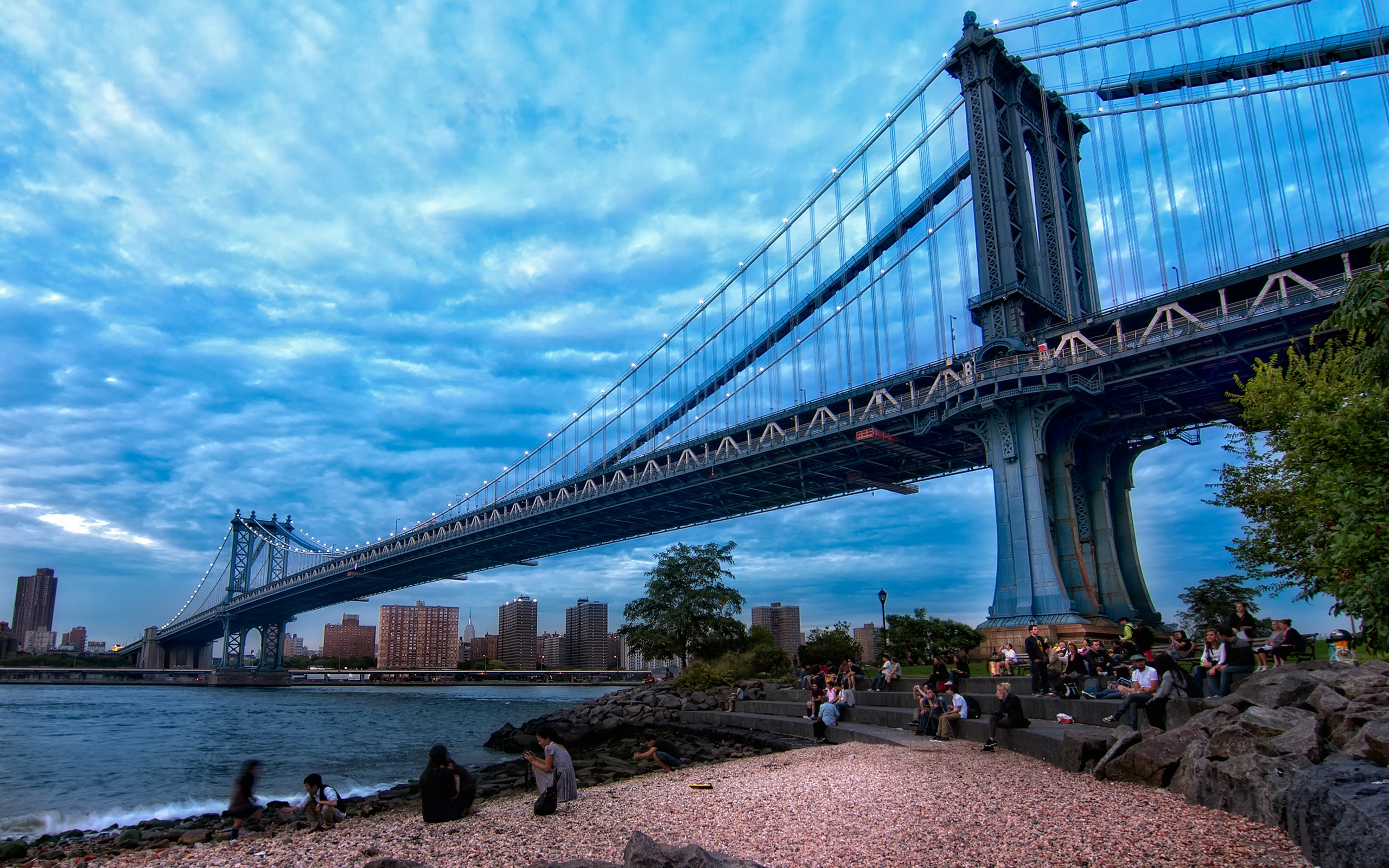 Description: A bridge over a body of water with people sitting on the rocks below it and a city in the background.