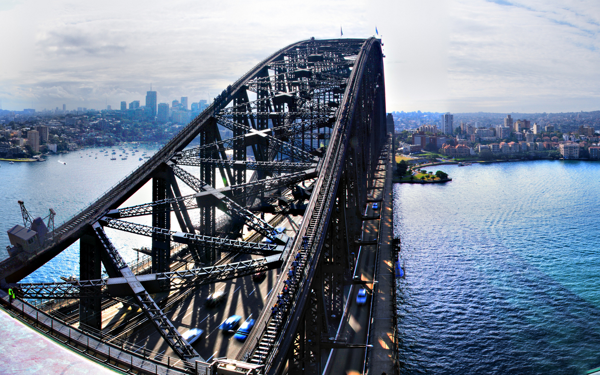 Description: A bridge over a body of water with a city in the background and a boat in the water below.