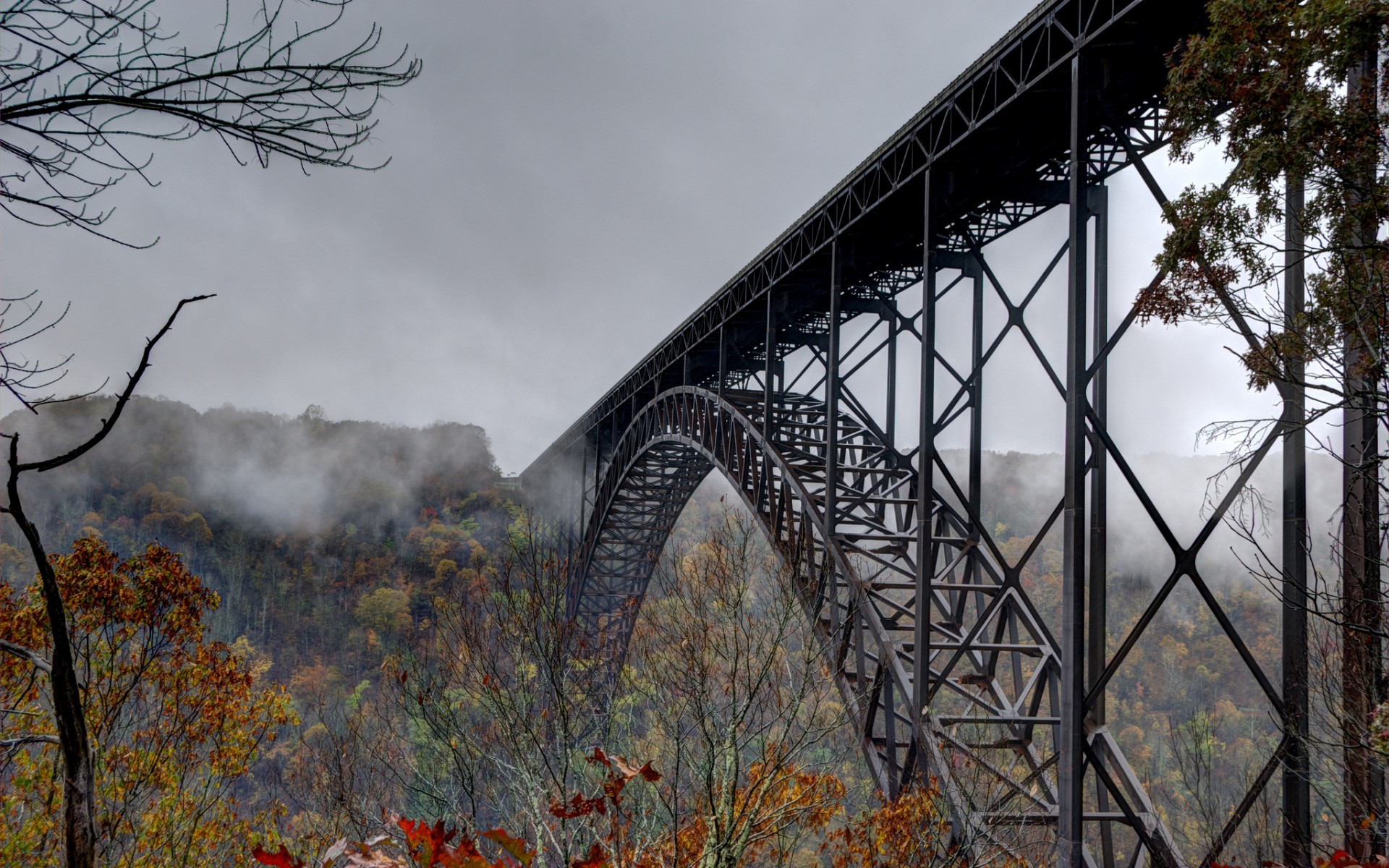 Description: A bridge that is over a hill with trees in the foreground and fog in the background.