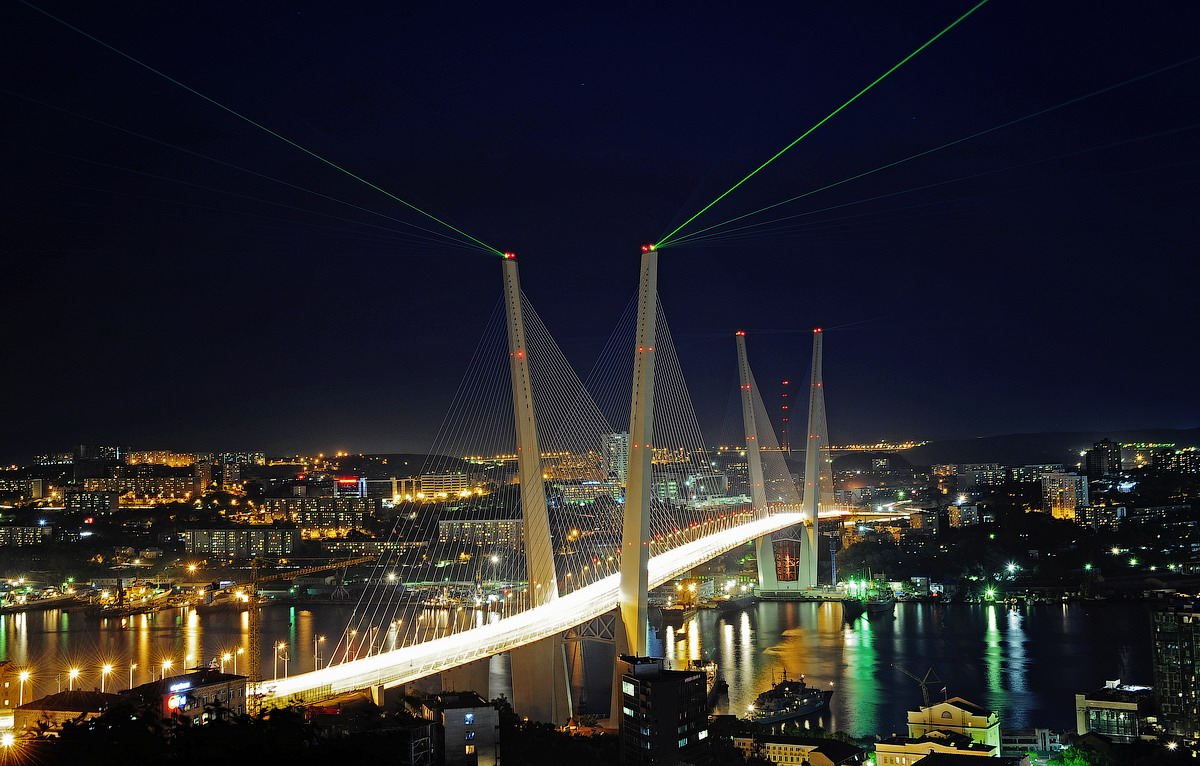 Description: A bridge with lights on at night over a city with lights on it and a bridge with a long bridge.