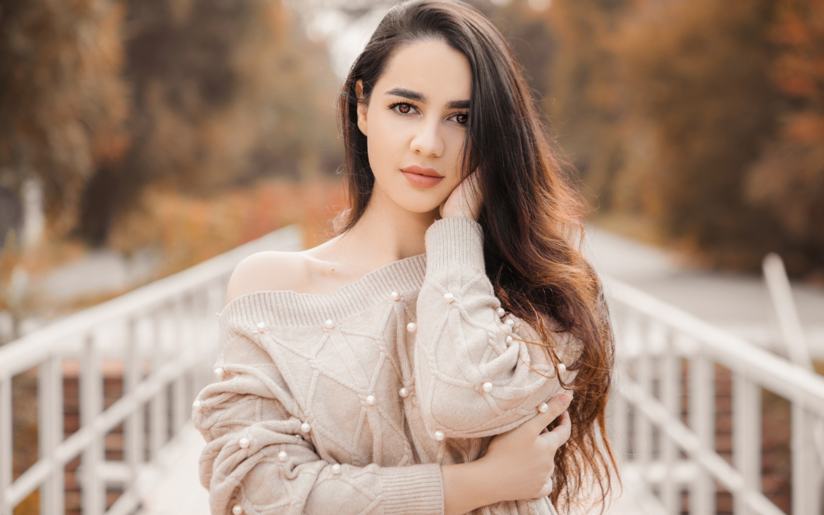 Description: A woman with long hair posing for a picture on a bridge with her hands on her face and her hand on her cheek.