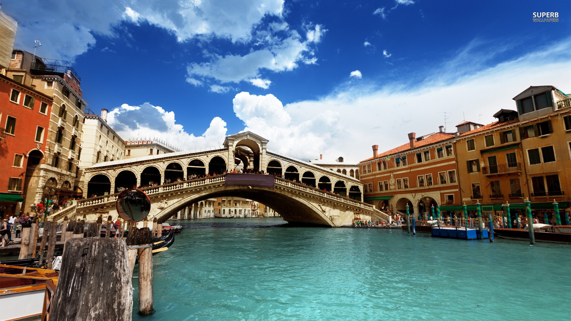 Description: A bridge over a river with a boat in the water and buildings around it and people standing on the bridge.