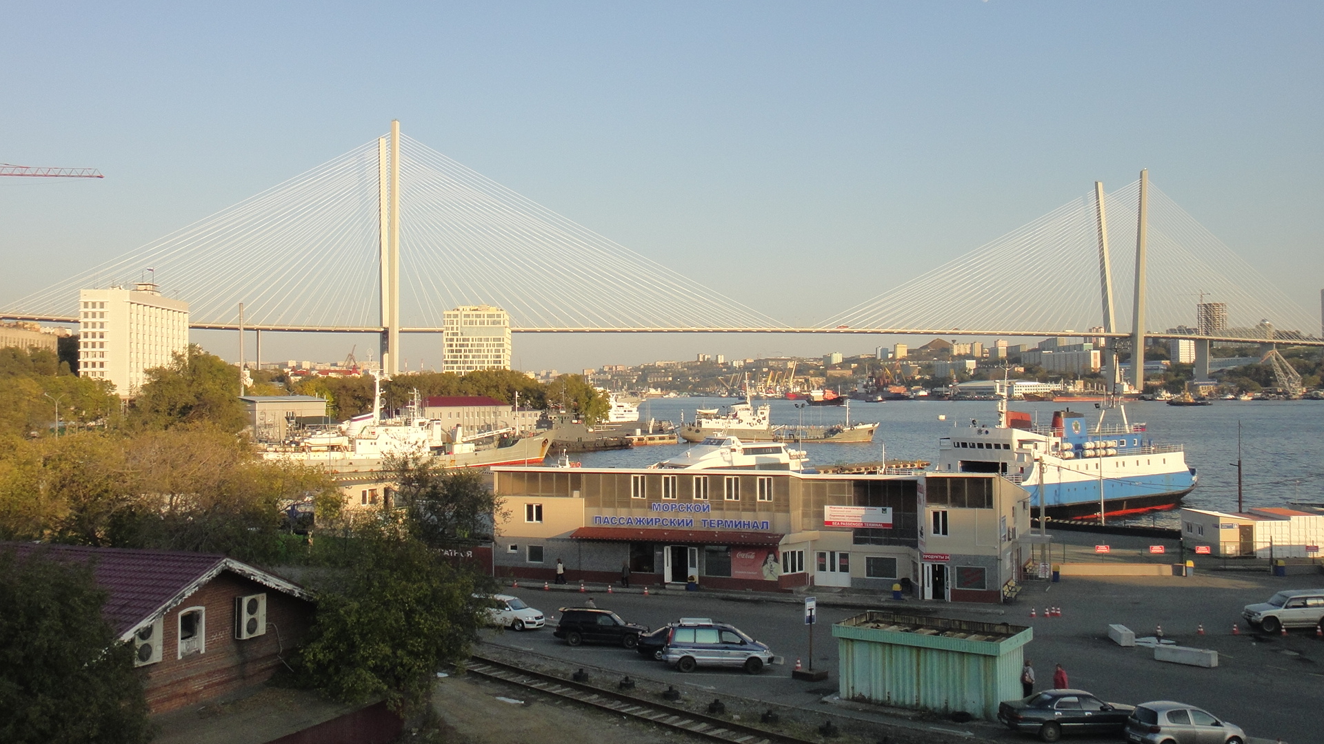 Description: A bridge spanning over a river with a bunch of cars parked on the side of it and a few buildings.