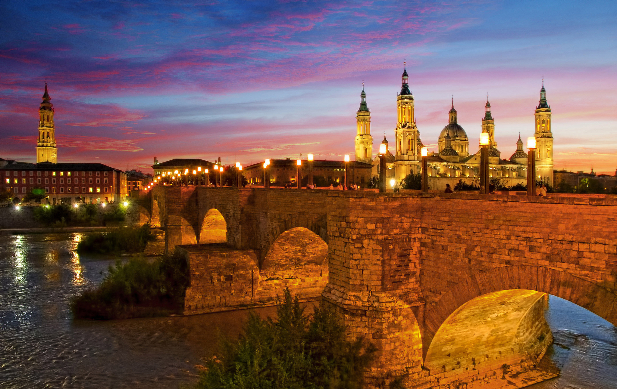 Description: A bridge over a river with a castle in the background at night time with lights on the buildings and a bridge in the foreground.