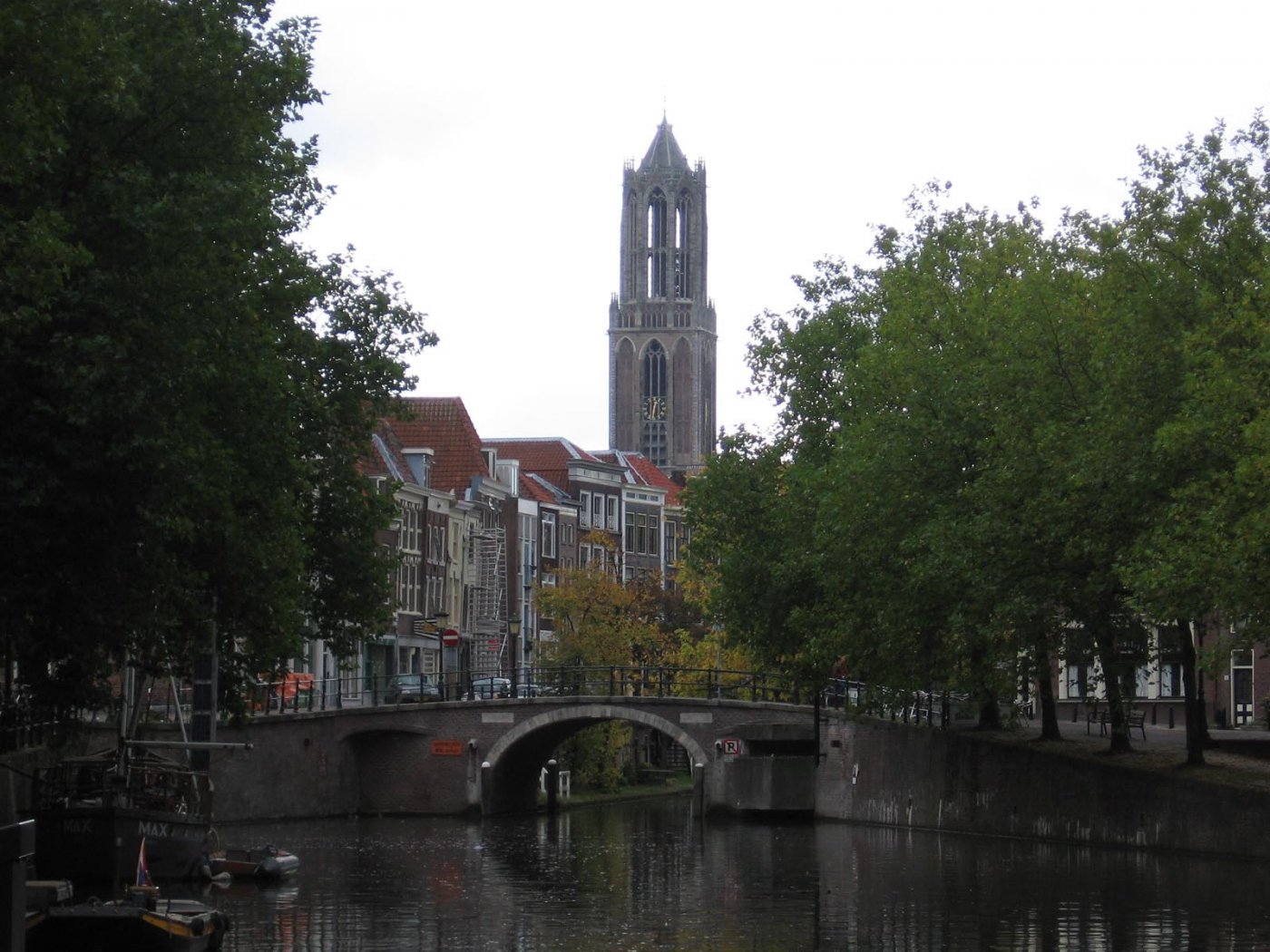Description: A bridge over a river with a church in the background and trees lining the sides of the riverbank.