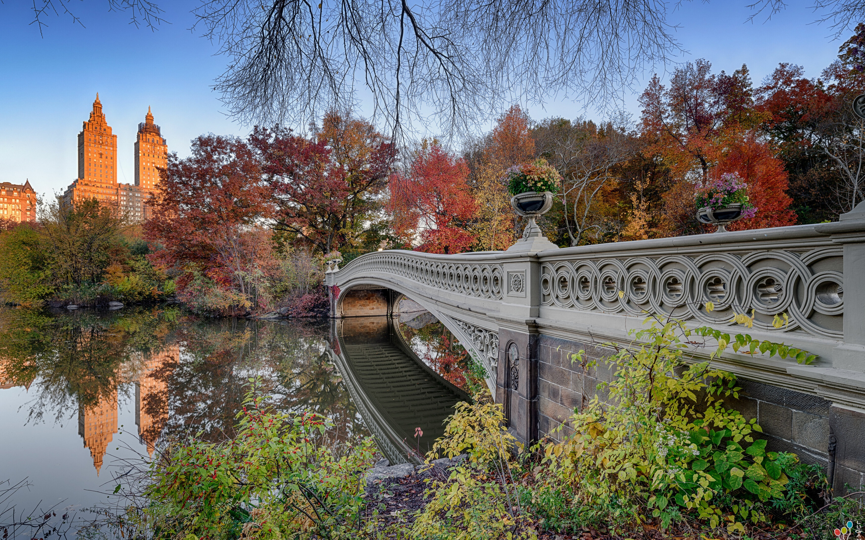Description: A bridge over a river with a city in the background at sunset or dawn with autumn foliage on the banks.