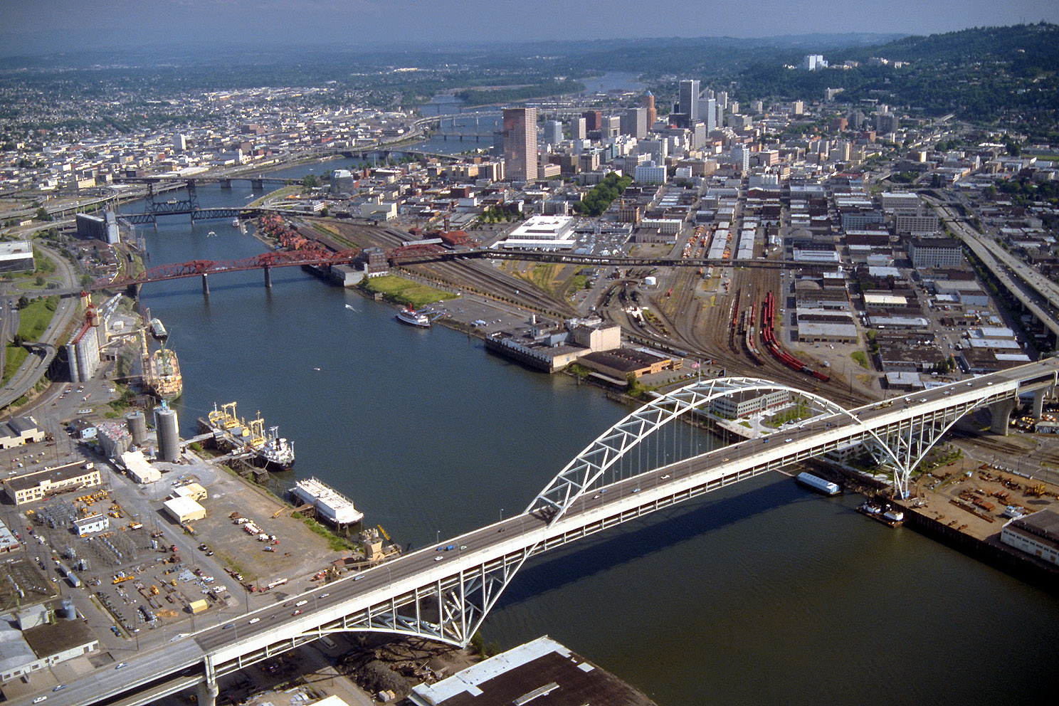 Description: A bridge over a river with a city in the background and a bridge over the water with a bridge going over it.