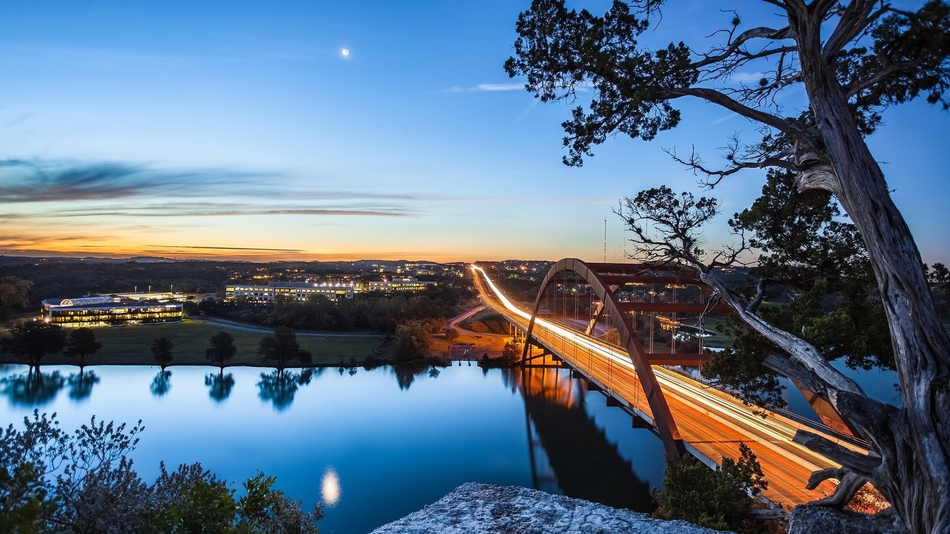 Description: A bridge over a river with a view of a city in the distance at night time with lights on.