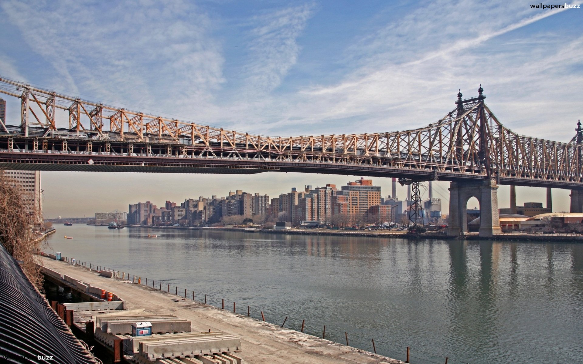 Description: A bridge over a river with a city in the background and a train on the bridge over the water.