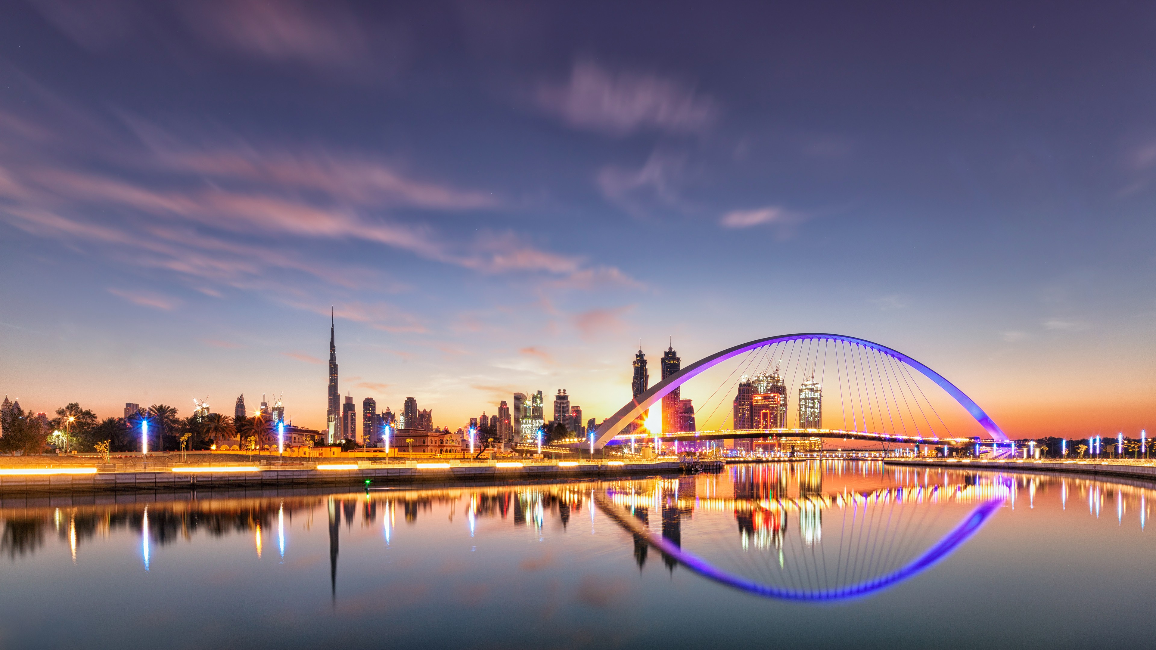 Description: A bridge over a river with a city in the background at night time with a bright blue sky and clouds.