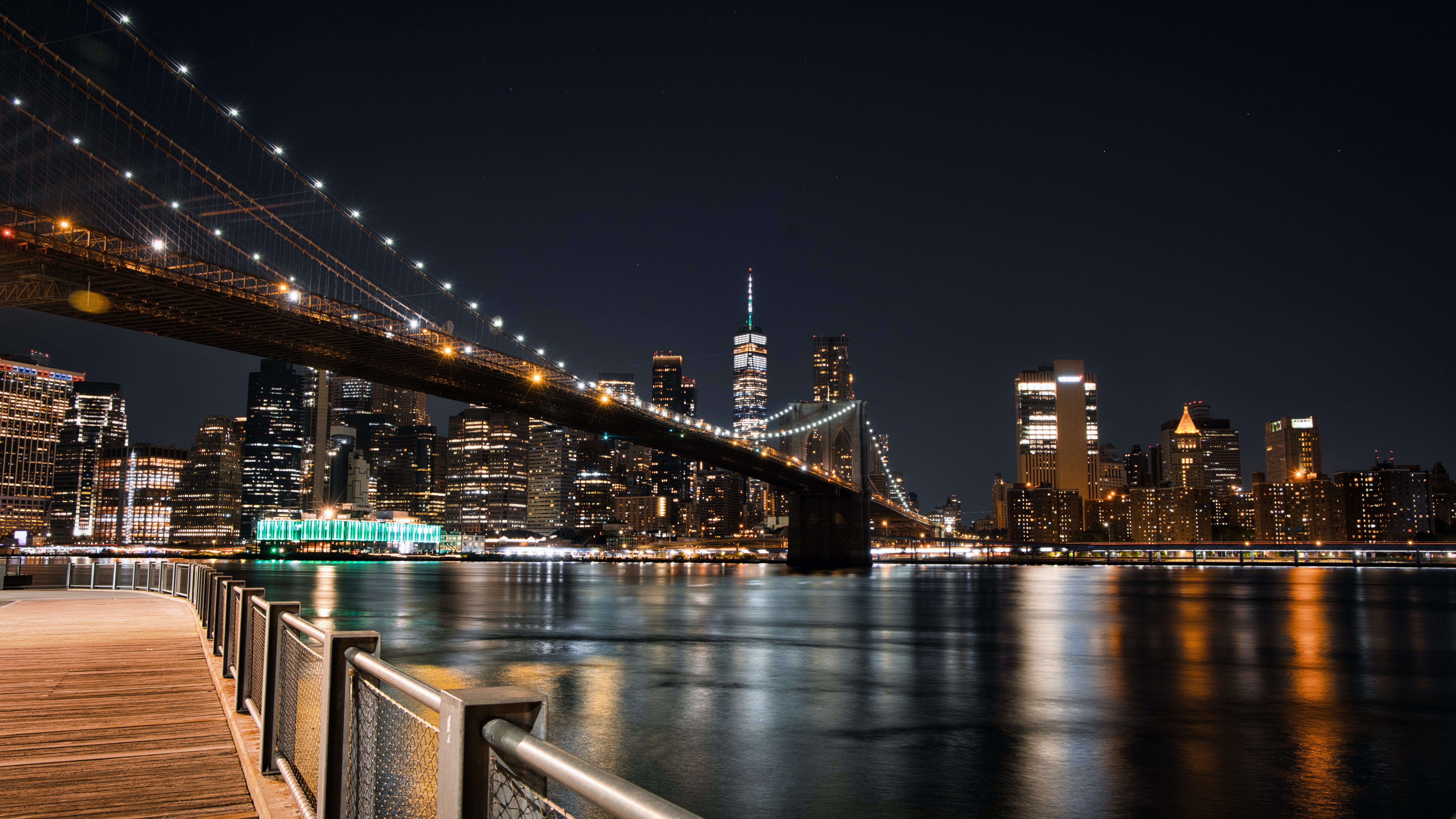 Description: A bridge over a river with a city skyline in the background at night time with lights on the bridge.