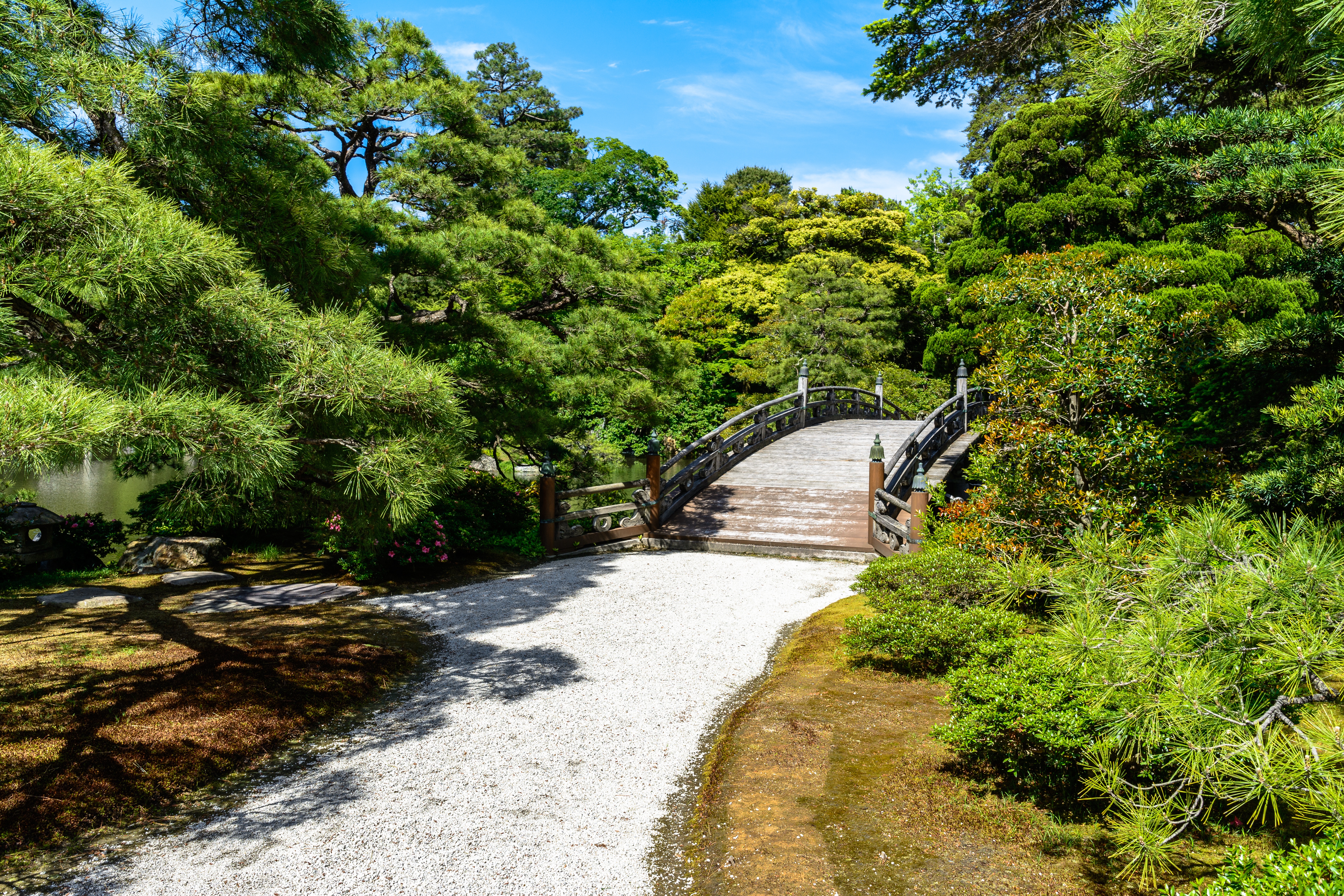 Description: A bridge over a river in a forest with a path leading to it and a bench on the other side.