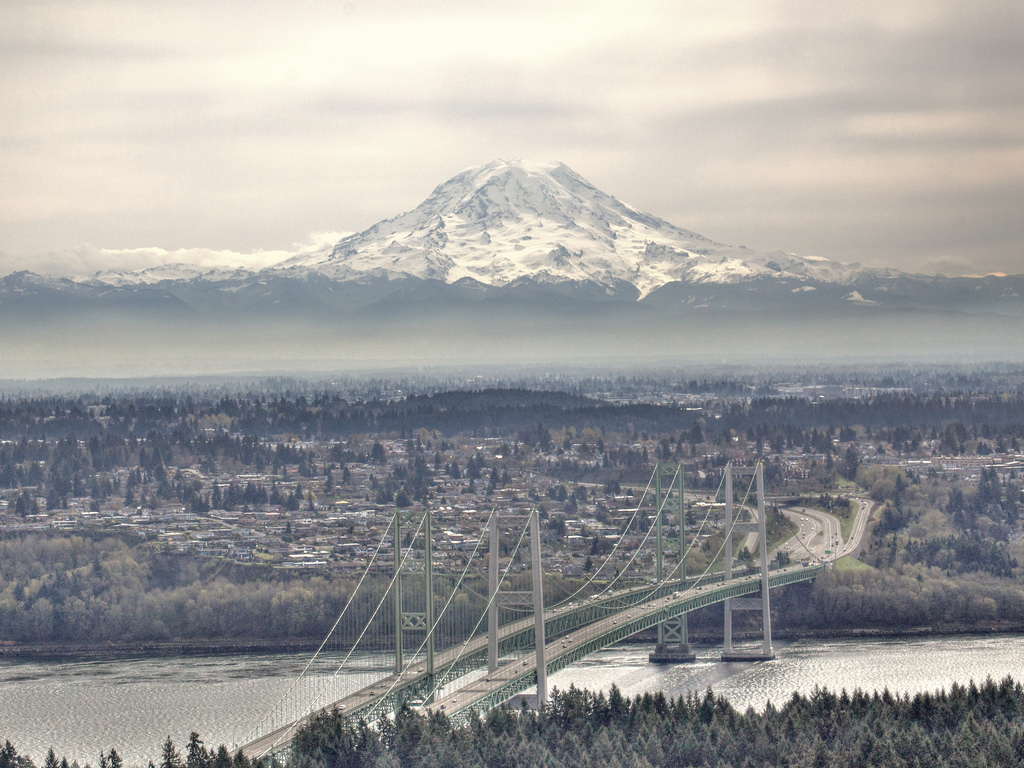 Description: A bridge that is going over a river with a mountain in the background and a river running through it.