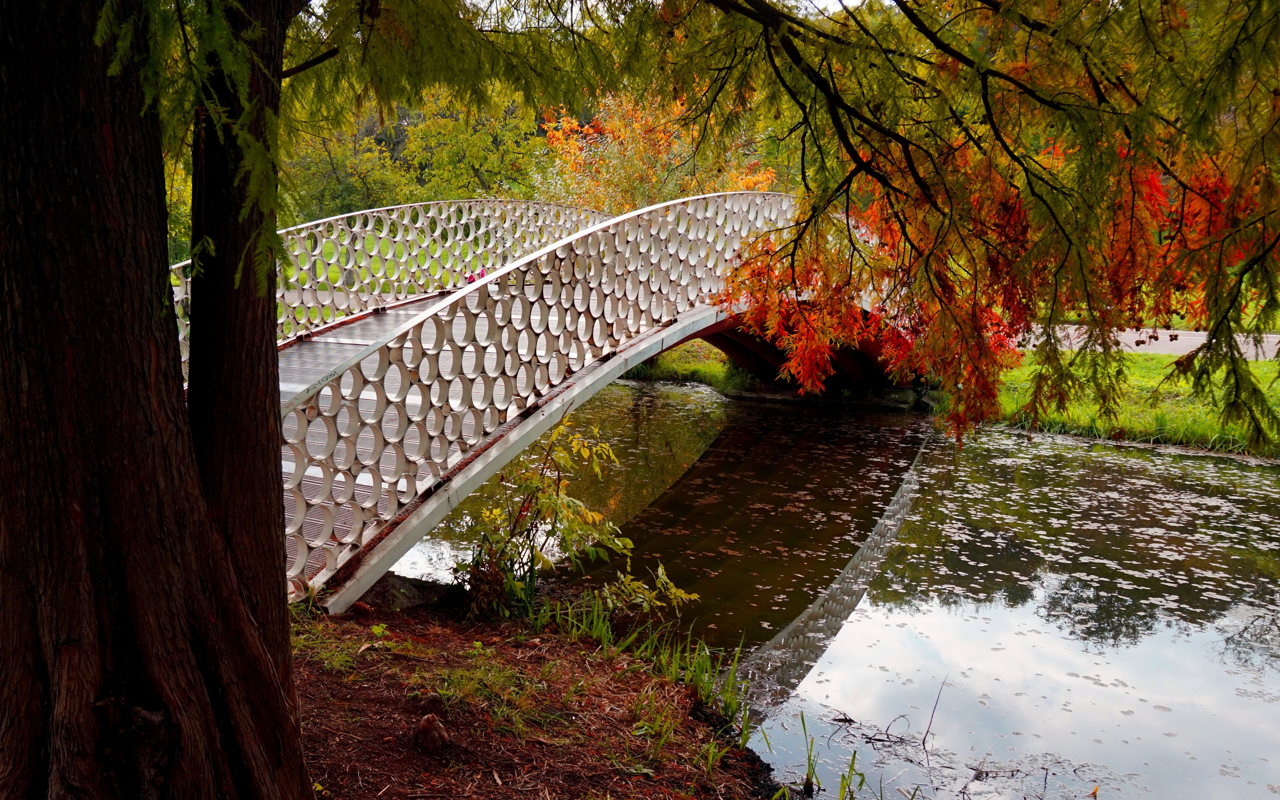Description: A bridge over a small river in a park with trees and water in the background and a few leaves on the ground.