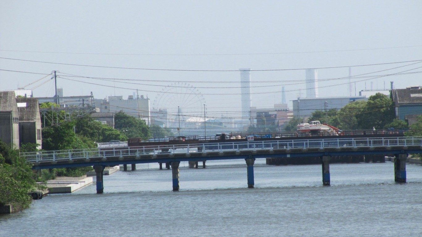 Description: A bridge over a river with power lines above it and a city in the background with power lines above it.