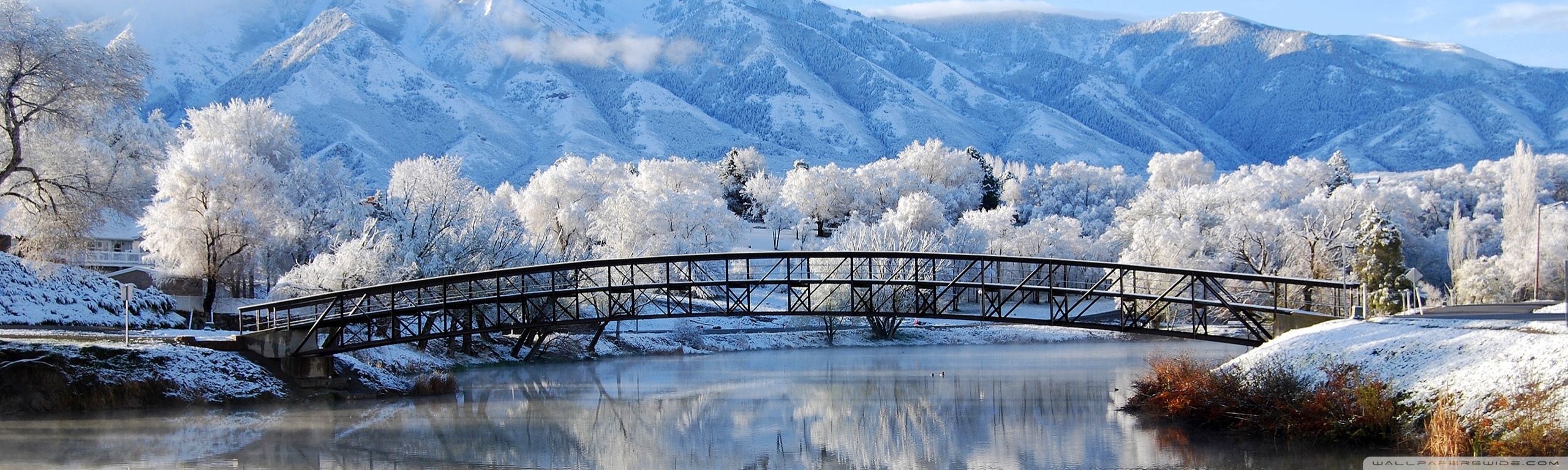 Description: A bridge over a river in a snowy mountain area with trees and snow covered mountains in the background and a blue sky.