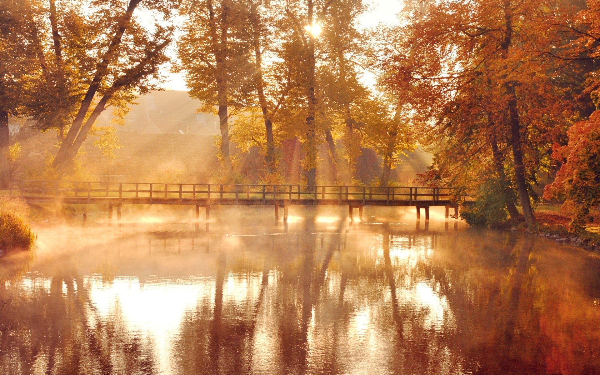 Description: A bridge over a river surrounded by trees and fog in the air with a bridge in the background and a body of water in the foreground.