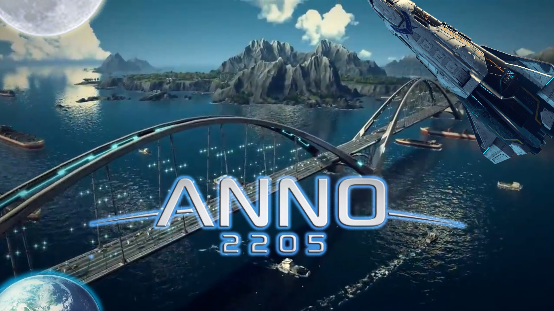 Description: A computer generated image of a bridge and a space ship in the background with the words anno 205.