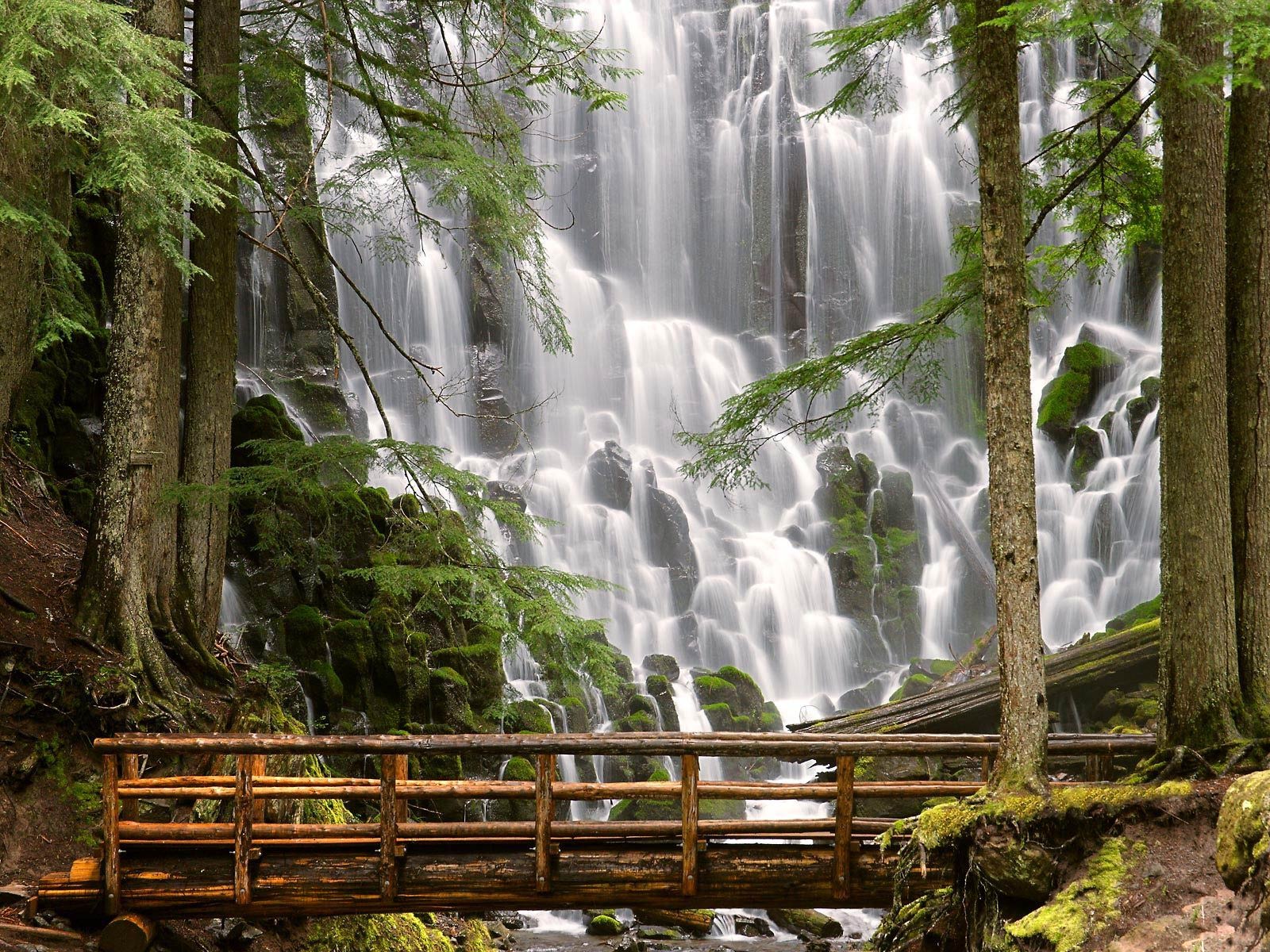 Description: A bridge over a stream in a forest with a waterfall in the background and a wooden bridge over the stream.