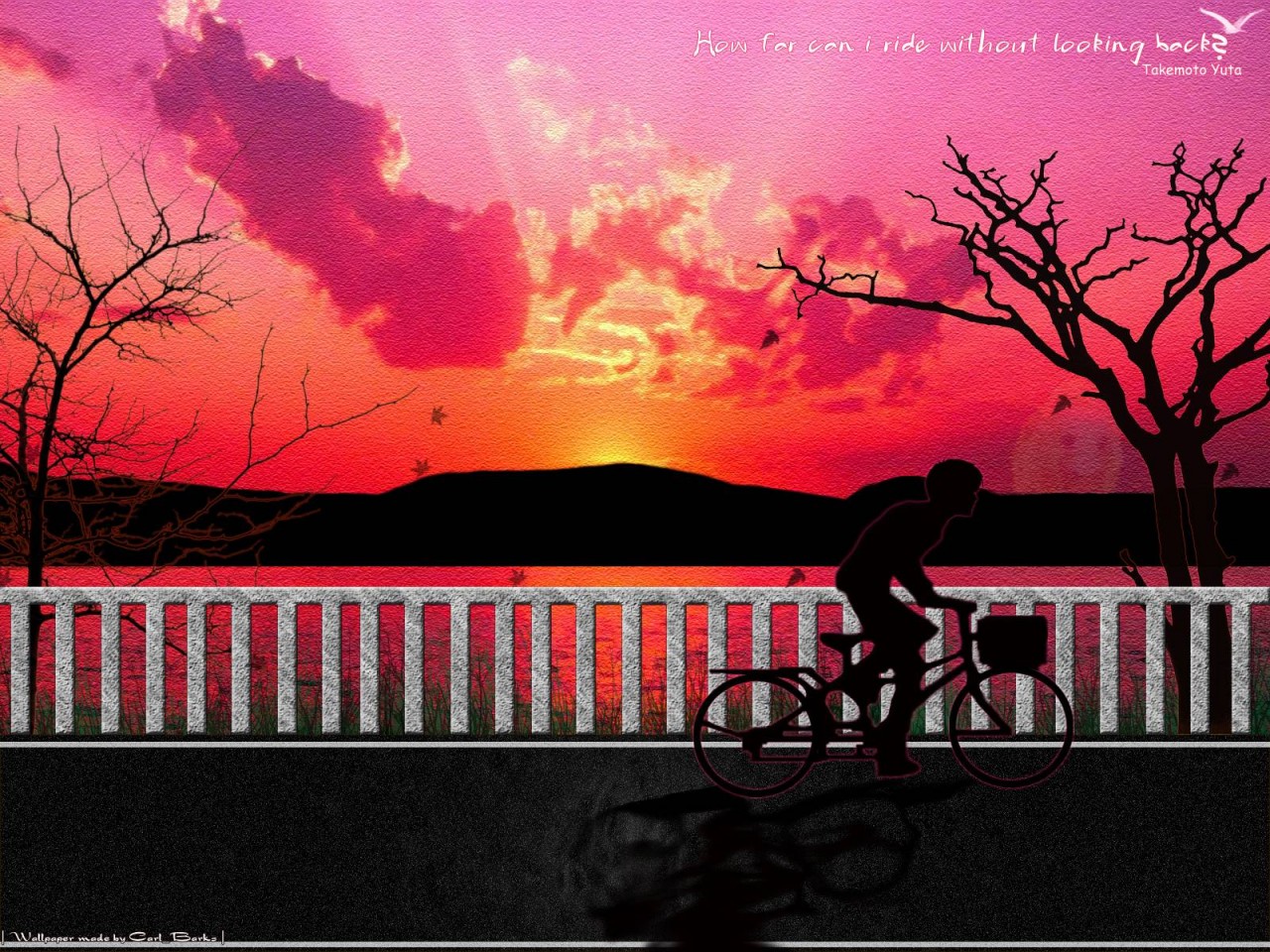 Description: A person riding a bike on a bridge at sunset with a pink sky in the background and a tree in the foreground.