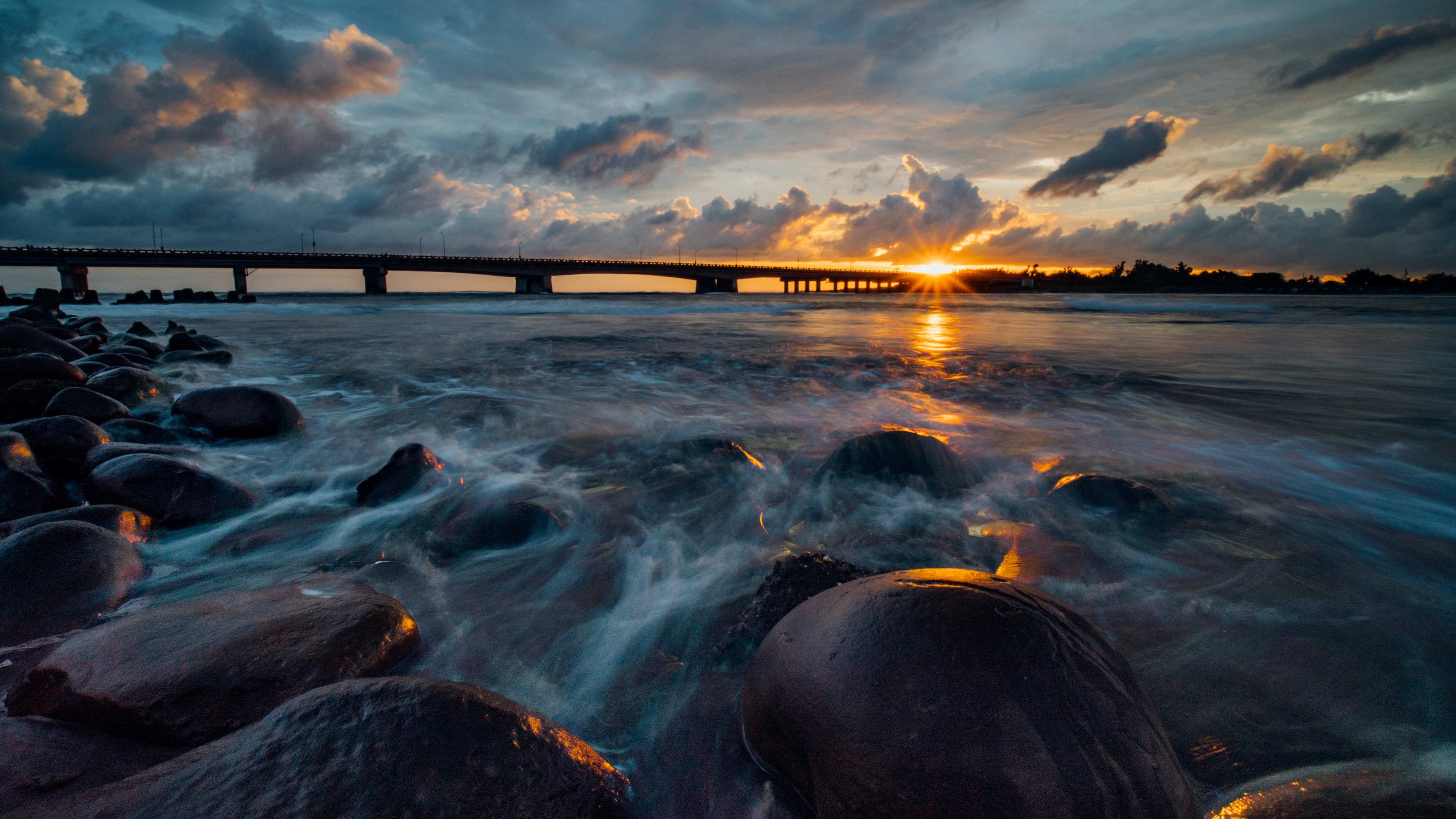Description: A bridge is seen in the distance as the sun sets over the water and rocks are in the foreground.