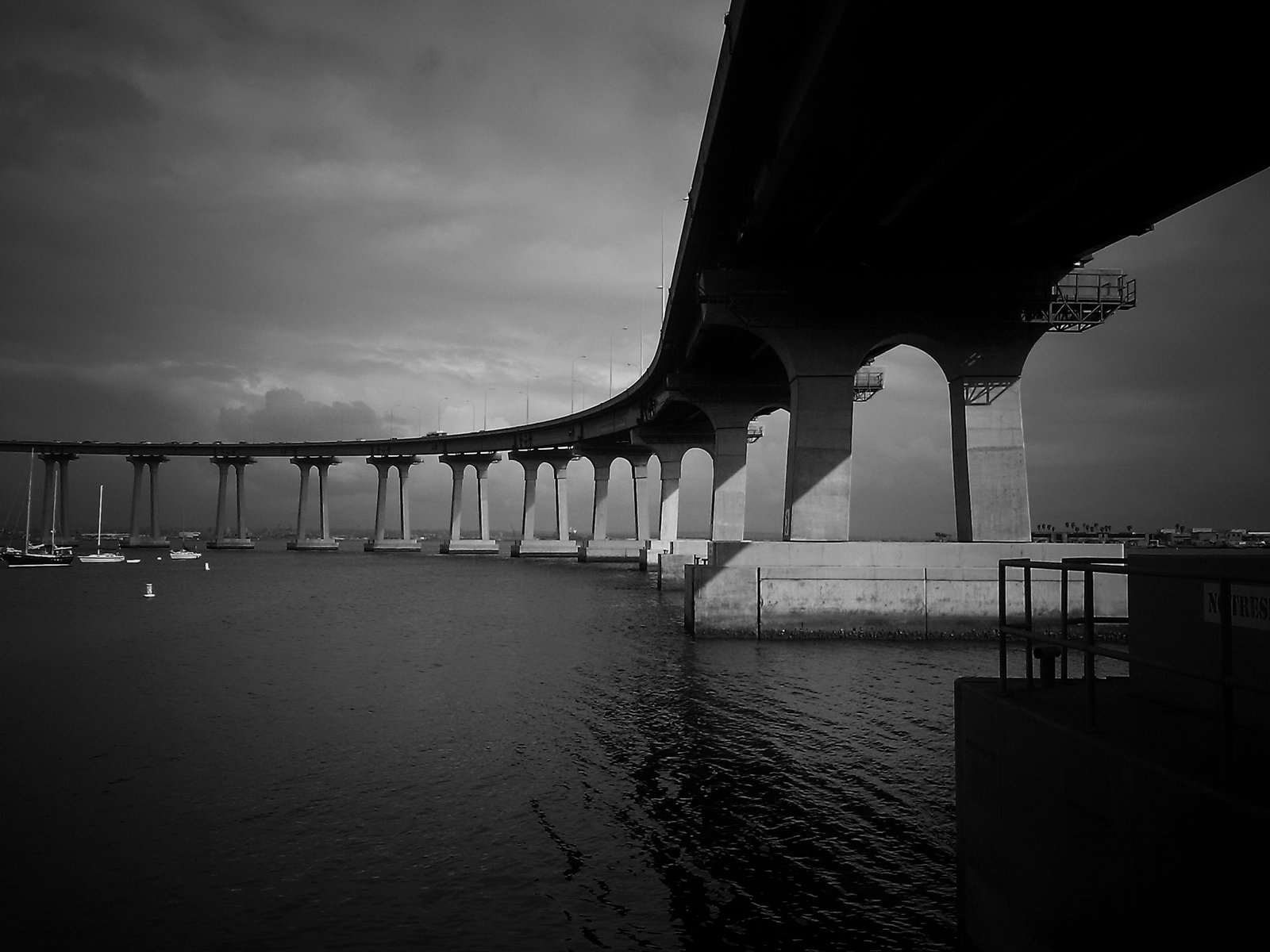Description: A bridge that is over water with a boat in the water below it and a boat in the water below it.