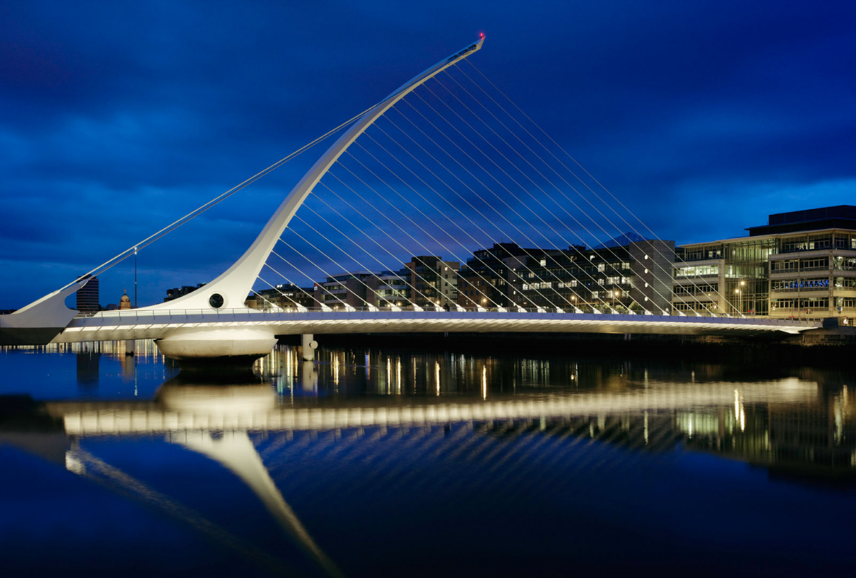 Description: A bridge that is over water with buildings in the background at night time with a blue sky and clouds.
