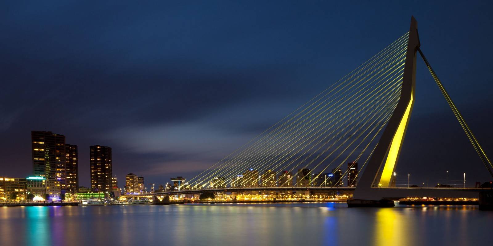 Description: A bridge that is over water with a city in the background at night time with lights on it and a city across the water.