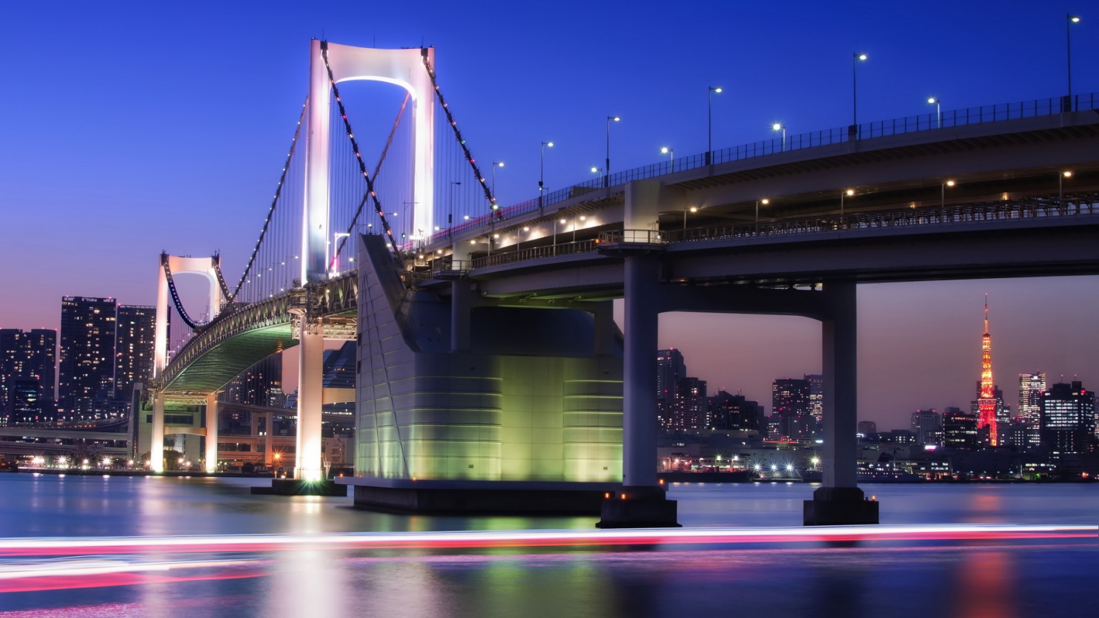 Description: A bridge over a body of water with a city in the background at night time with lights on it.