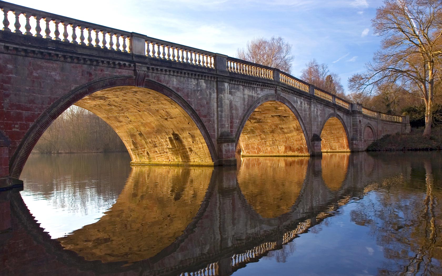 Description: A bridge over a body of water with a fence on top of it and a few trees in the background.