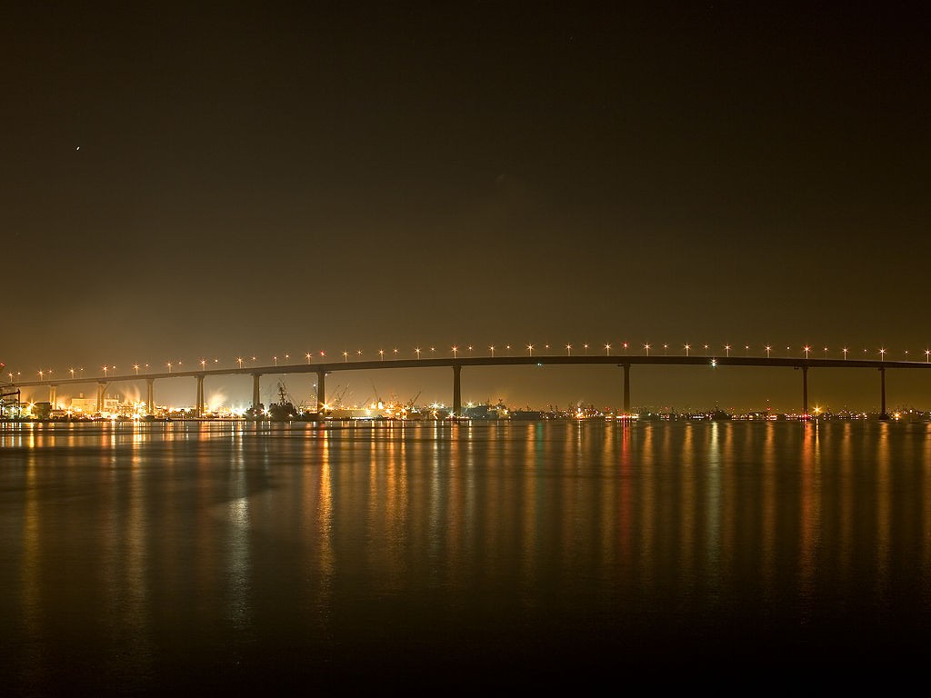 Description: A bridge over a body of water at night with lights on it and a bridge in the background with a bridge in the distance.