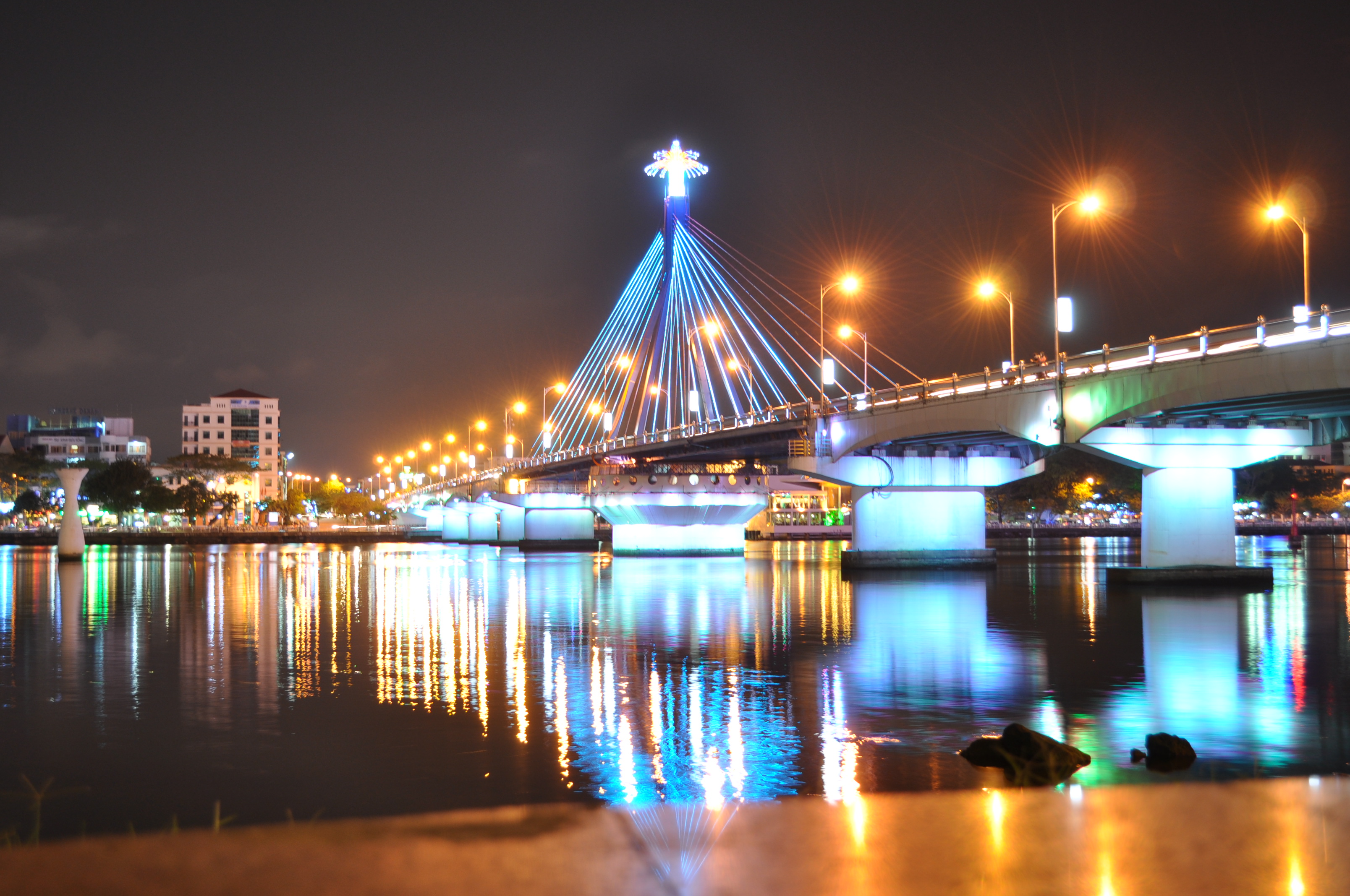 Description: A bridge that is over a body of water at night time with lights on it and a city in the background.