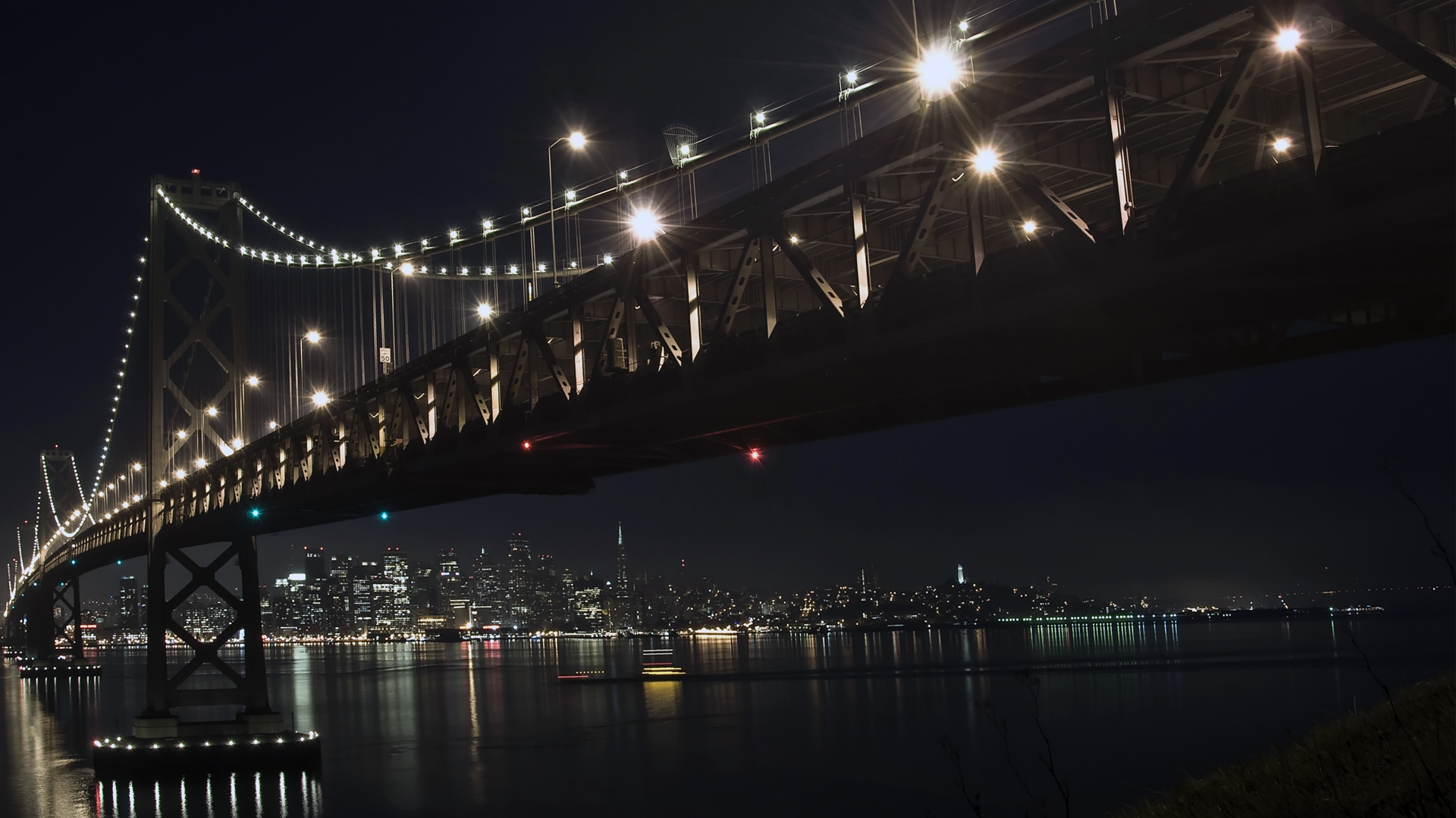 Description: A bridge over a body of water at night with lights on it and a city in the background at night.