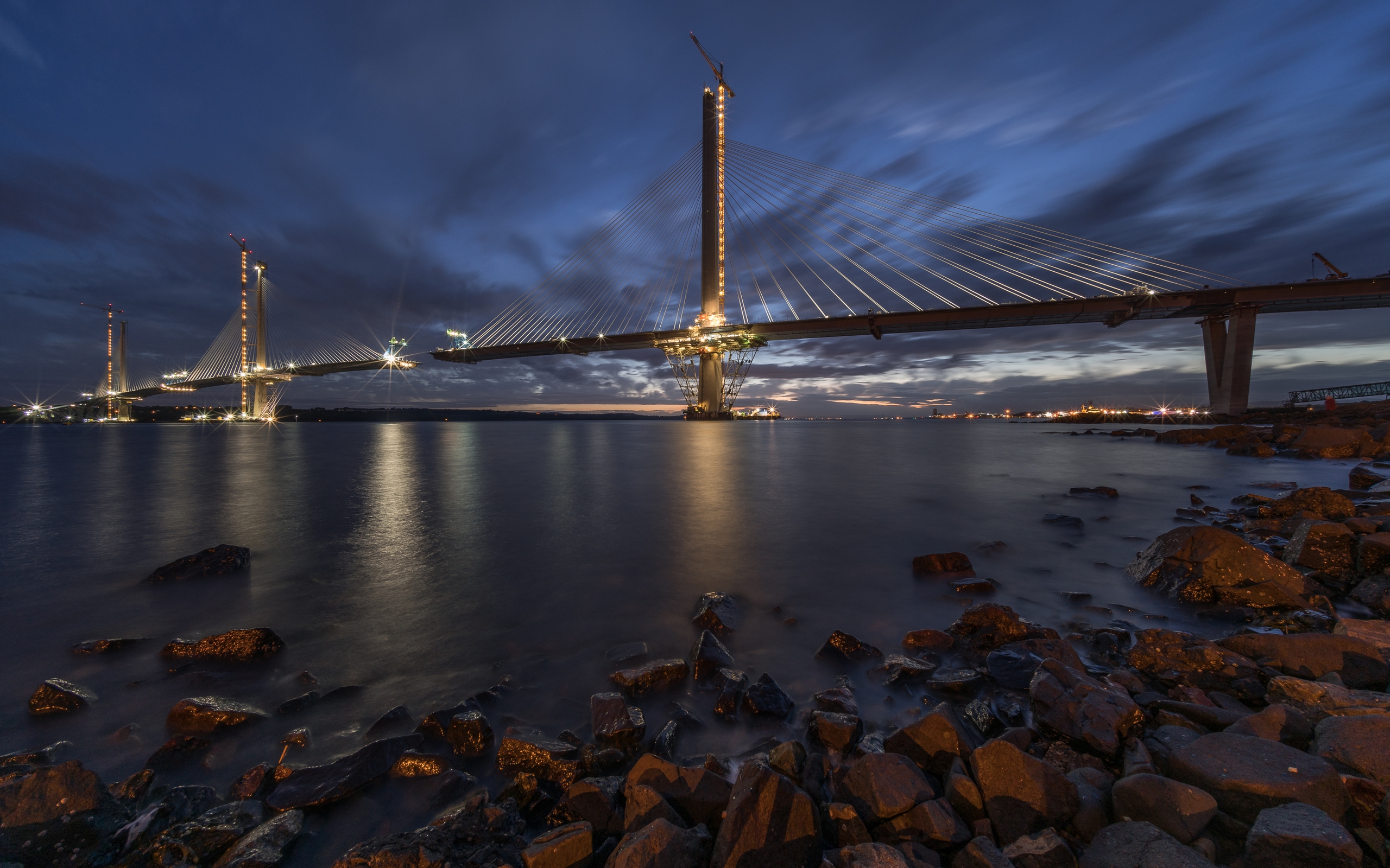 Description: A bridge that is over water with rocks in front of it and a sky background with clouds in the sky.