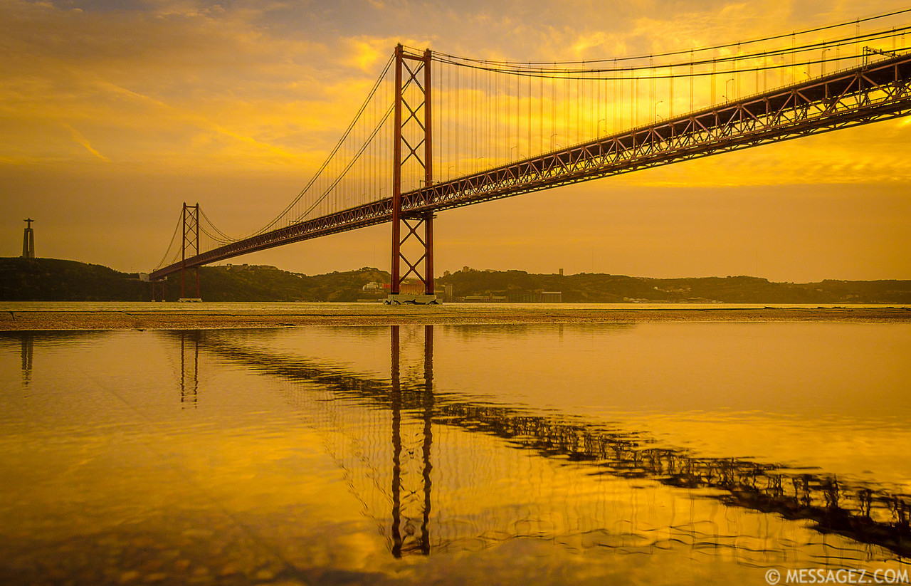 Description: A bridge that is over water with a sky background and clouds in the background and a yellow sky reflecting on the water.