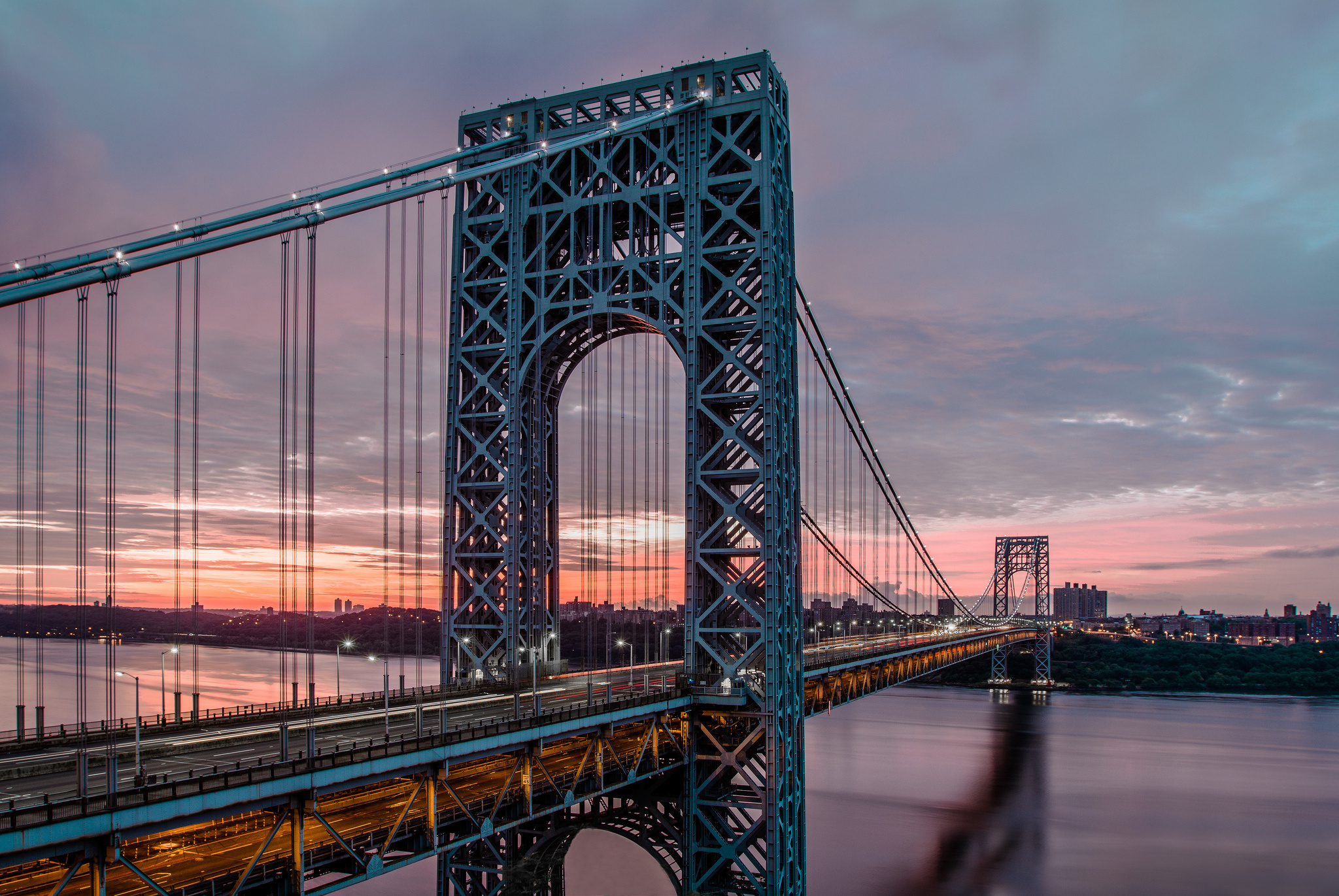Description: A bridge that is over water with a sunset in the background and a city in the distance with a bridge in the foreground.