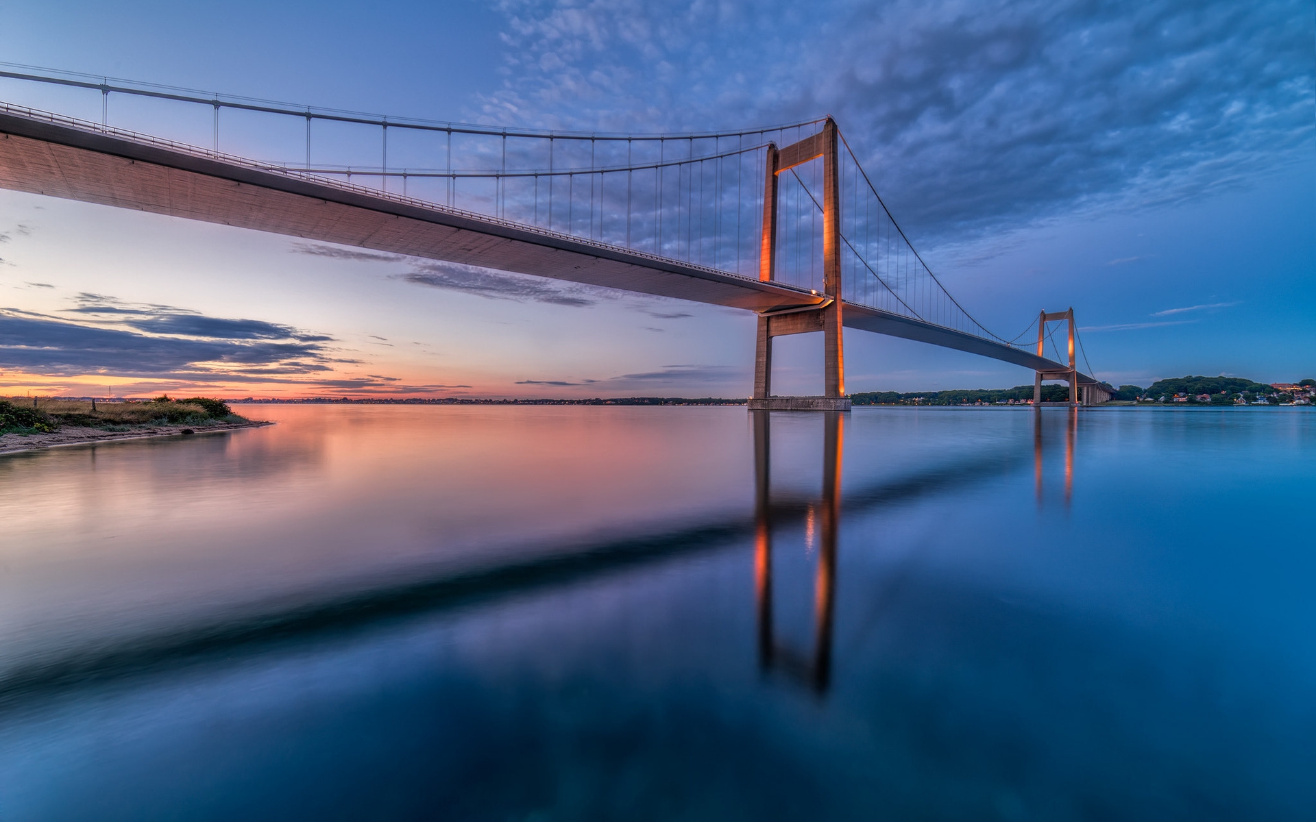 Description: A bridge that is over water with a sky background and clouds in the background and a sunset in the foreground.