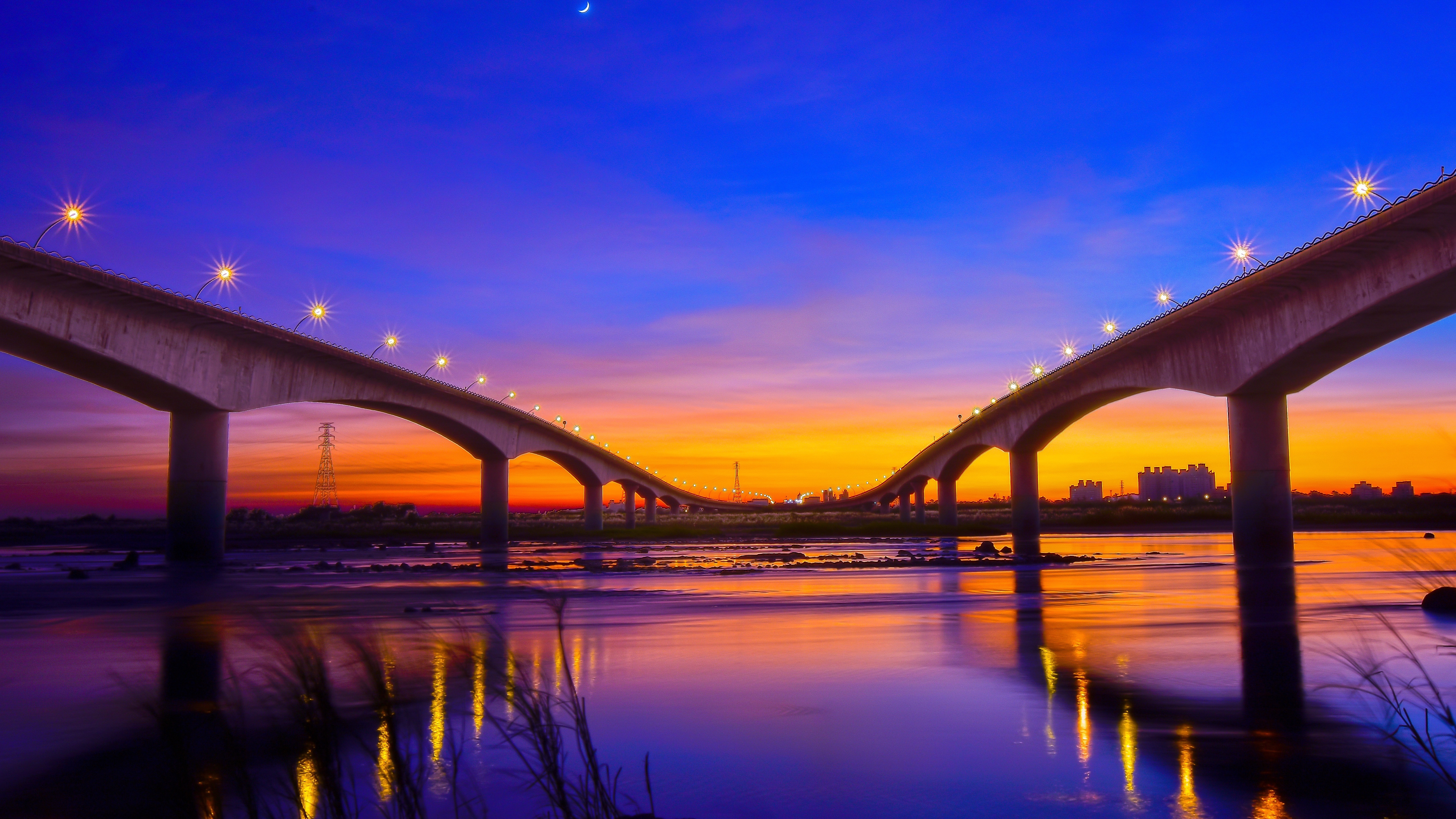 Description: A bridge that is over a body of water at sunset with lights on it and a city in the background.