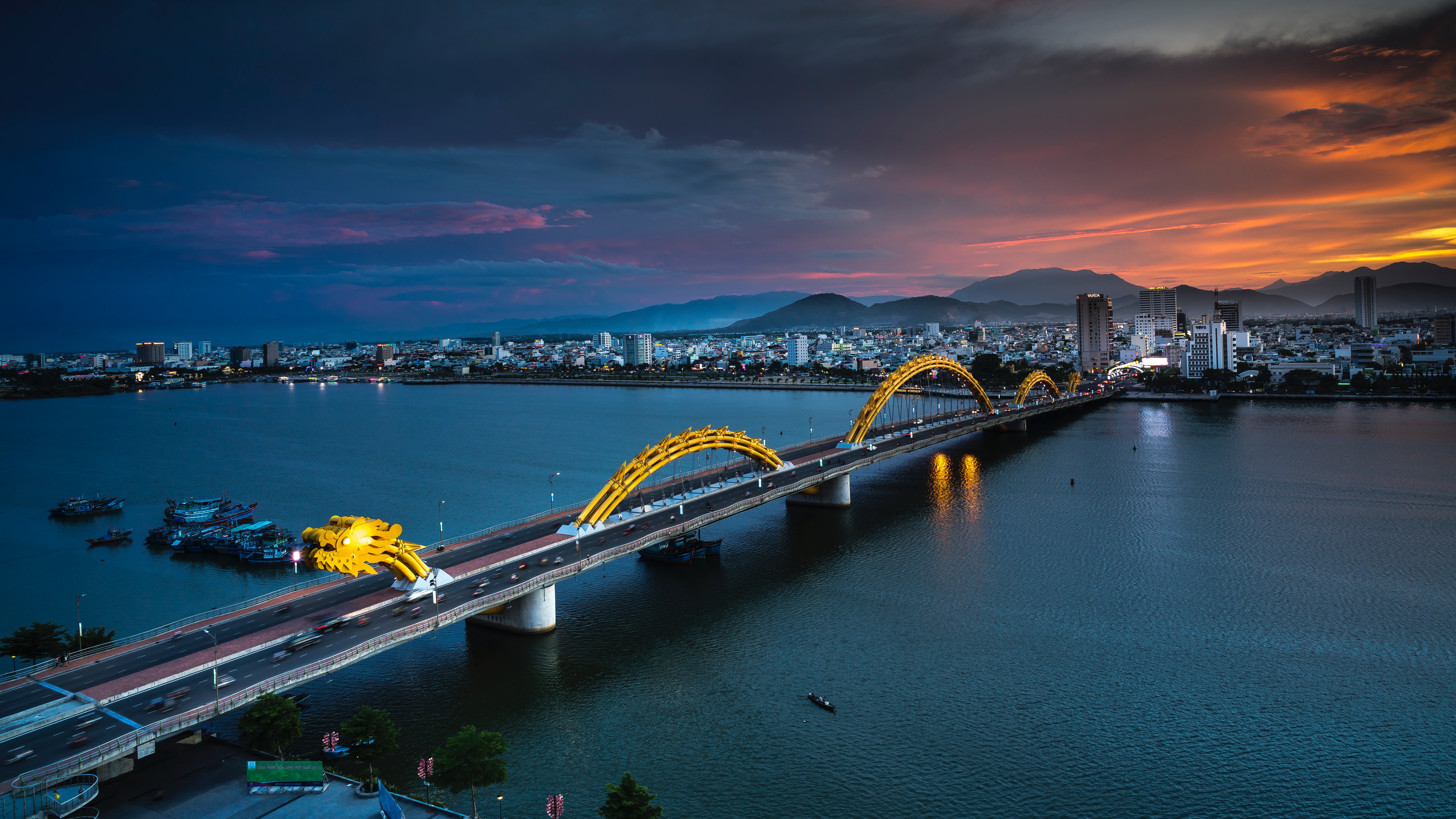 Description: A bridge with a yellow dragon on it over a river with a city in the background at sunset or dawn.