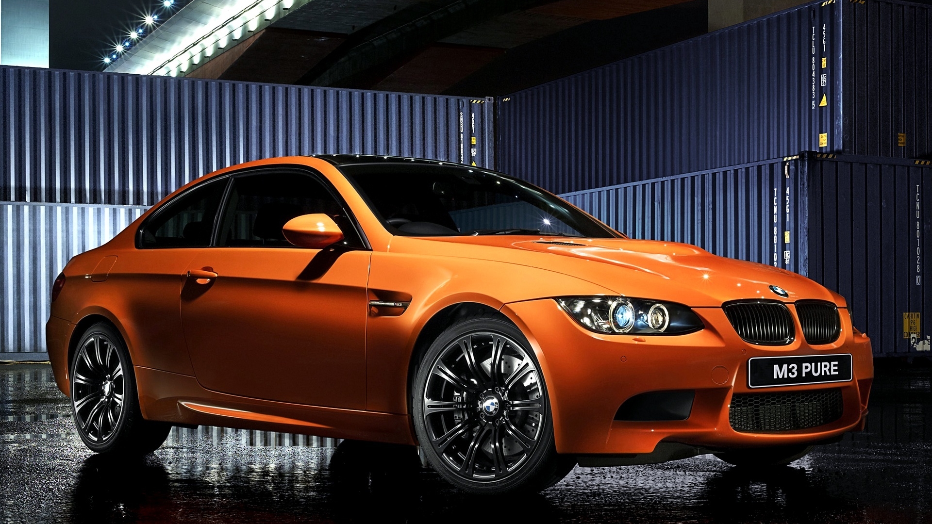 Description: A bright orange car parked in a garage next to a wall of blue corrugated doors and a blue wall.