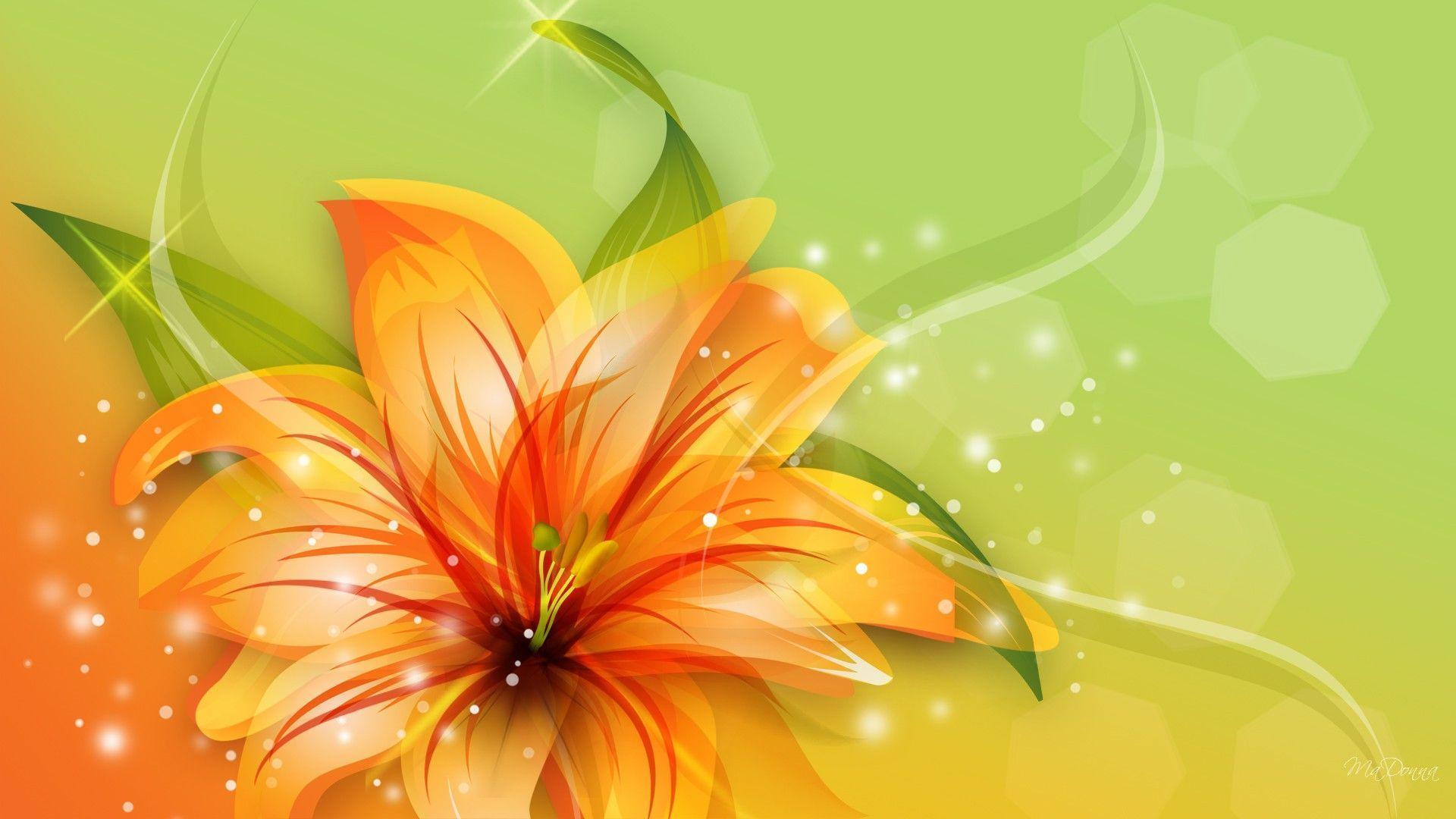 Description: A bright orange flower with green leaves on a green background with a swirly pattern and a starburst.