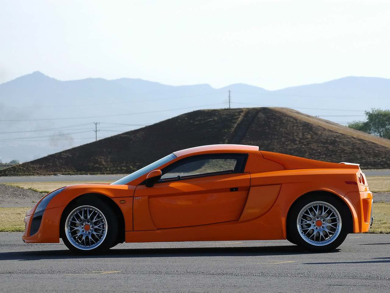 Description: A bright orange sports car parked in a parking lot with mountains in the background and a hill of grass.