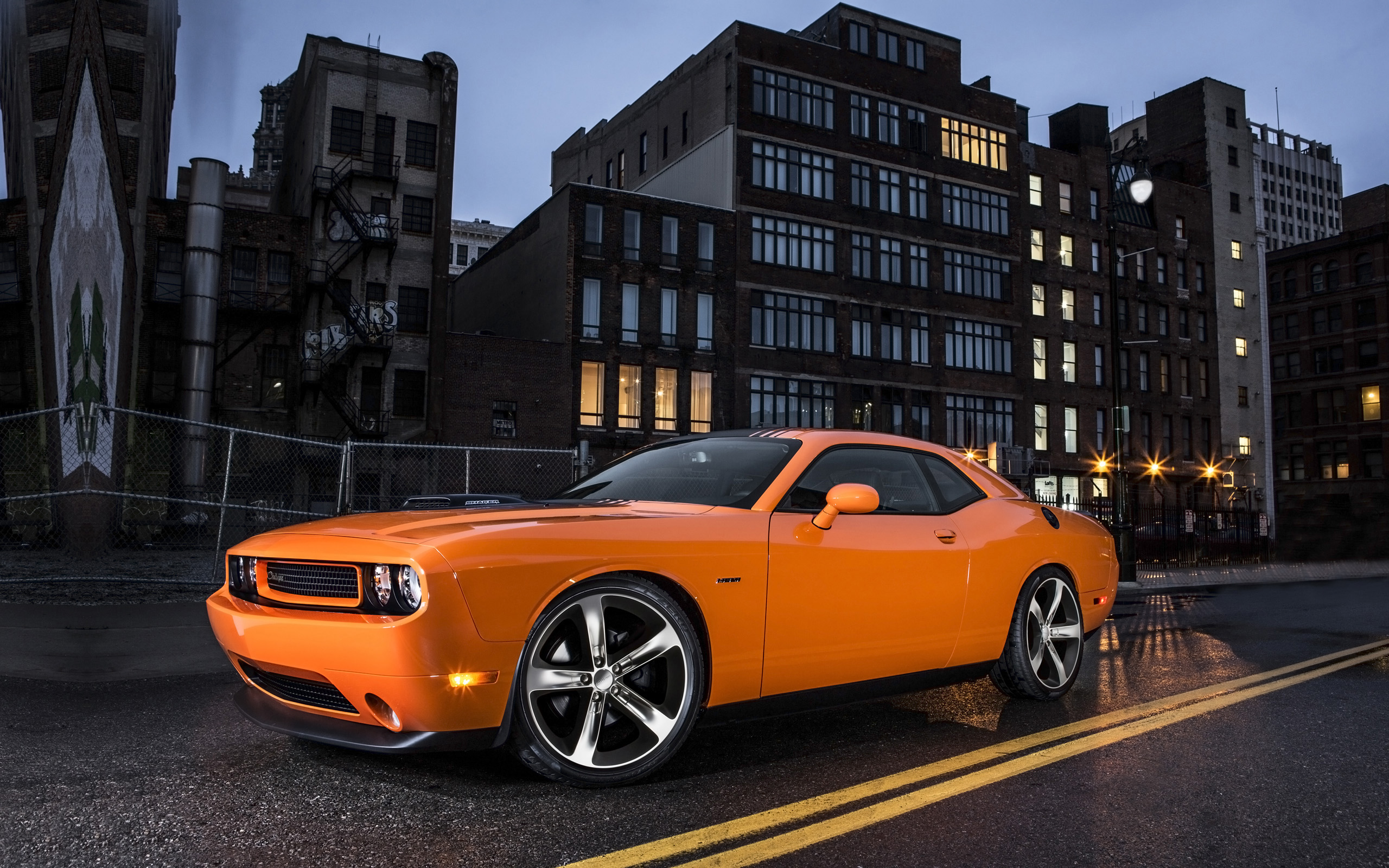 Description: A bright orange sports car parked in front of a building at night time with lights on and a city street in the background.